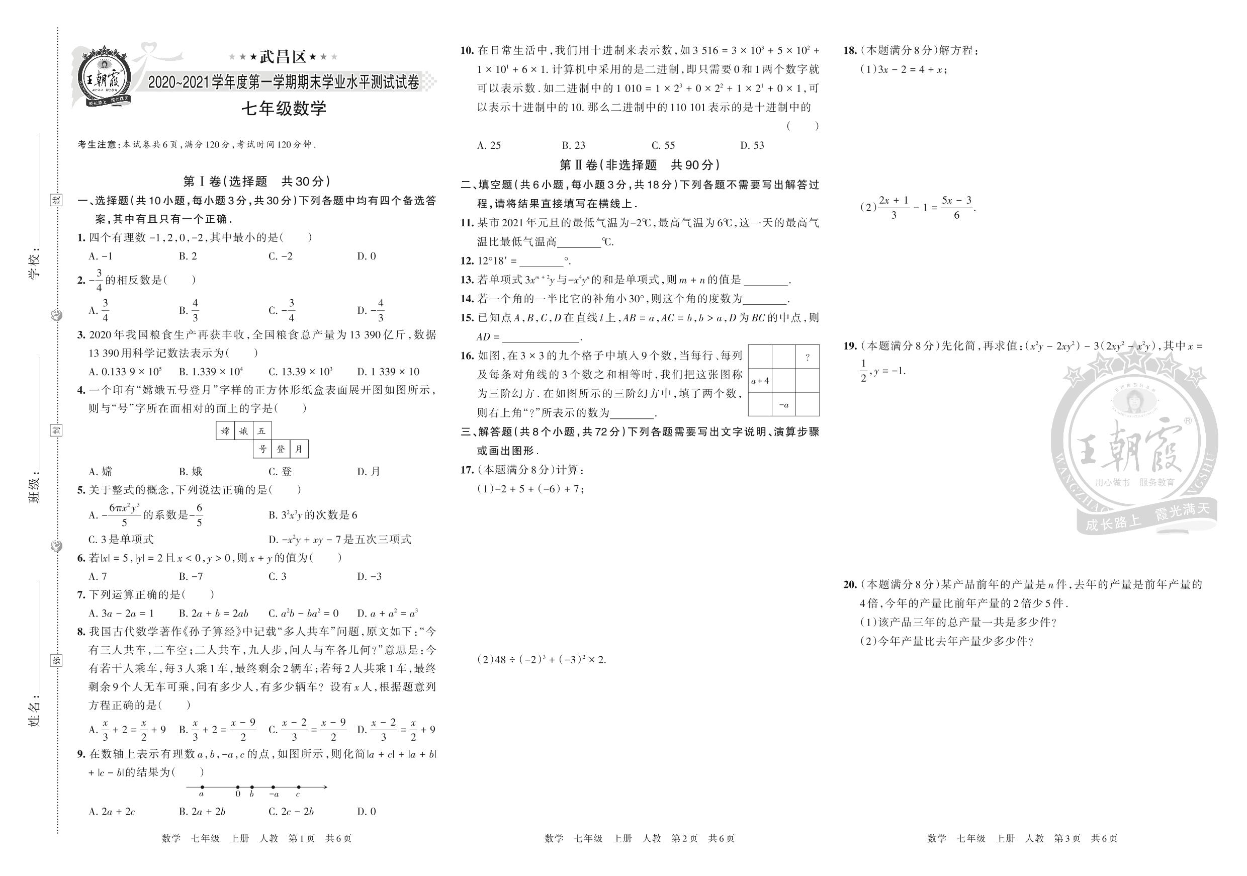 武昌区2020~2021学年度第一学期期末学业水平测试试卷七年级数学(人教版)【4】