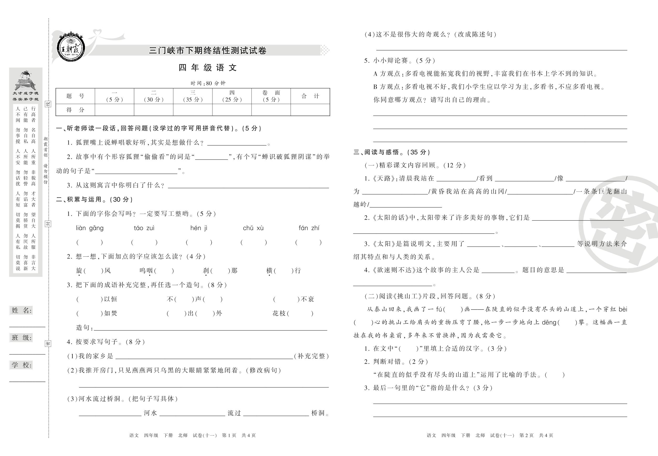 2015-2016学年第二学期三门峡市四年级语文试卷(北师版)【11】