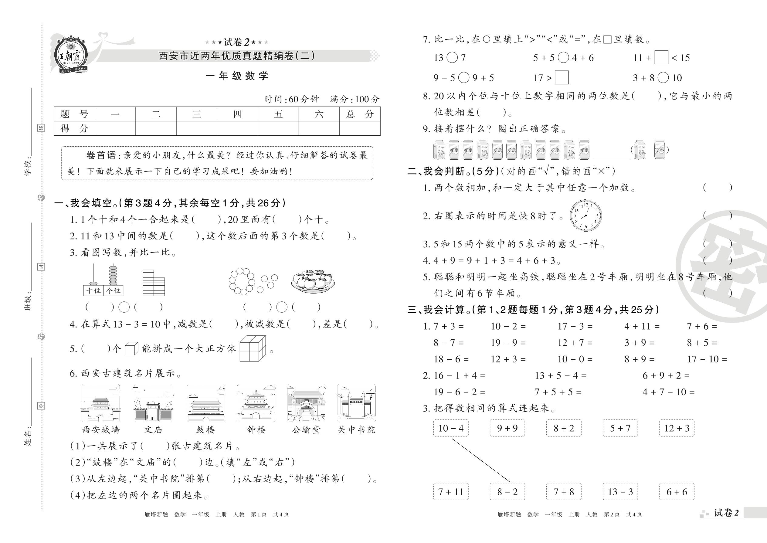 西安市近两年优质试题精编卷(二)一年级上册数学(人教版)_R211119100732256【2】