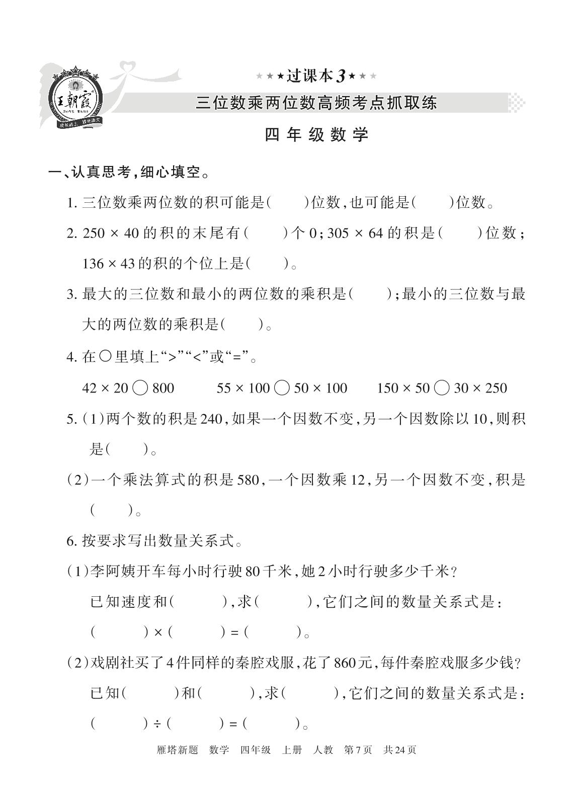 王朝霞期末过课本——三位数乘两位数高频考点抓取练四年级上册数学(人教版)_R211119101032823【3】