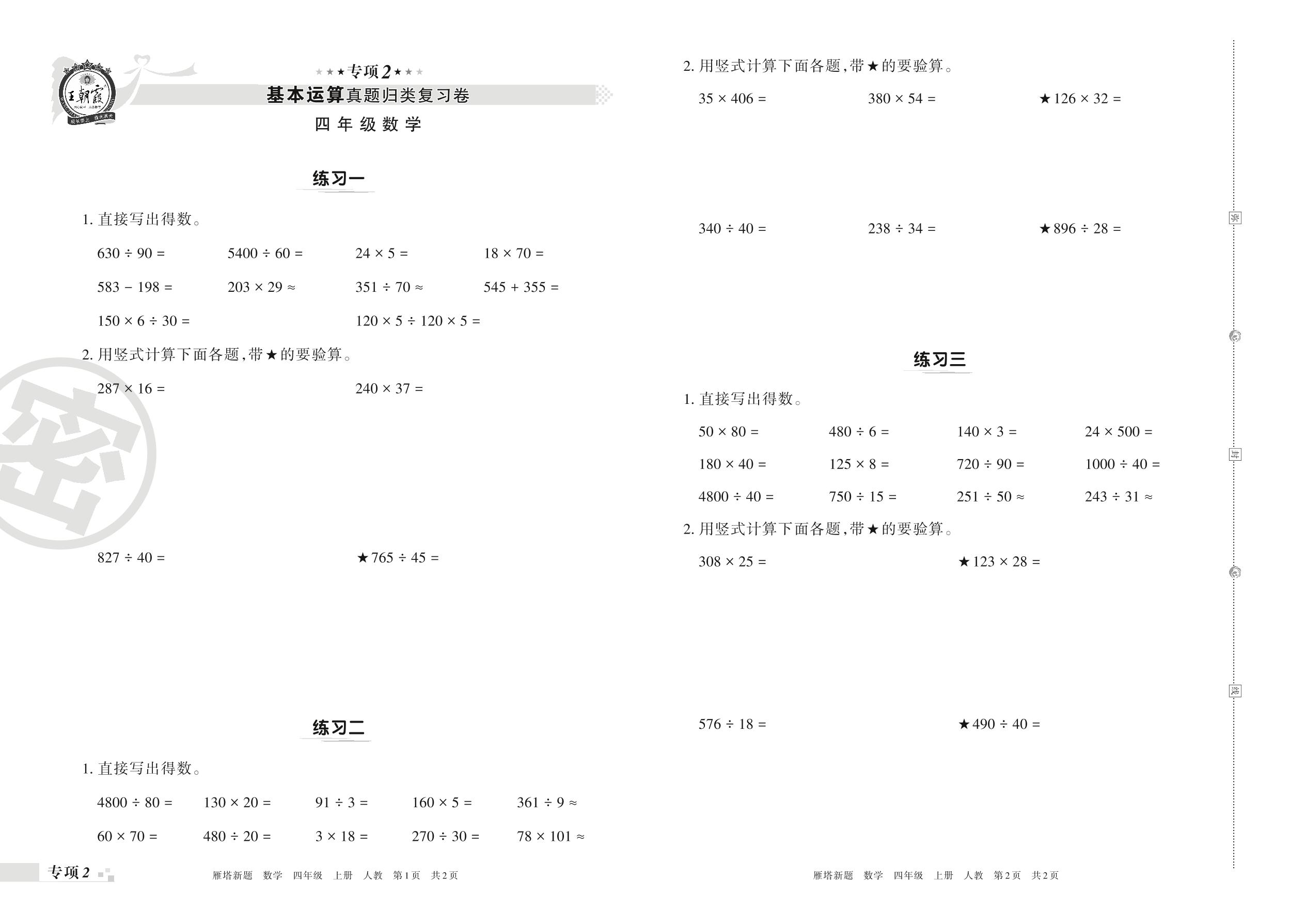 王朝霞期末专项卷——基本运算真题归类复习卷四年级上册数学(人教版)_R211119101032228【2】