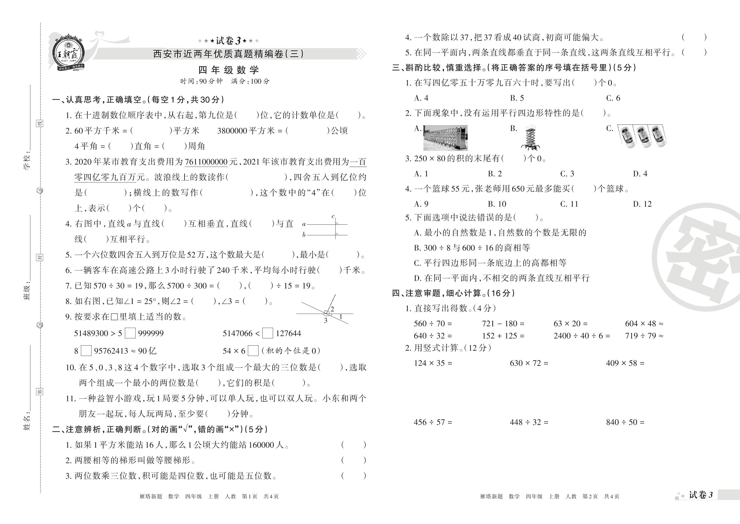 西安市近两年优质试题精编卷(三)四年级上册数学(人教版)_R211119101032381【3】