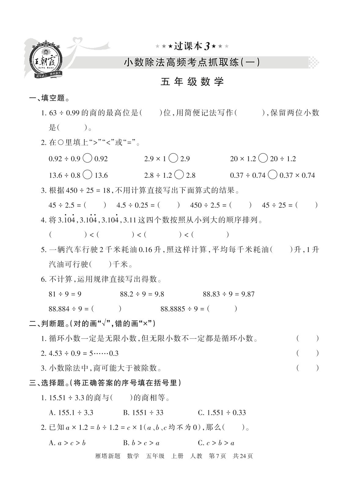 王朝霞期末过课本——小数除法高频考点抓取练(一)五年级上册数学(人教版)_R211119101548258【3】