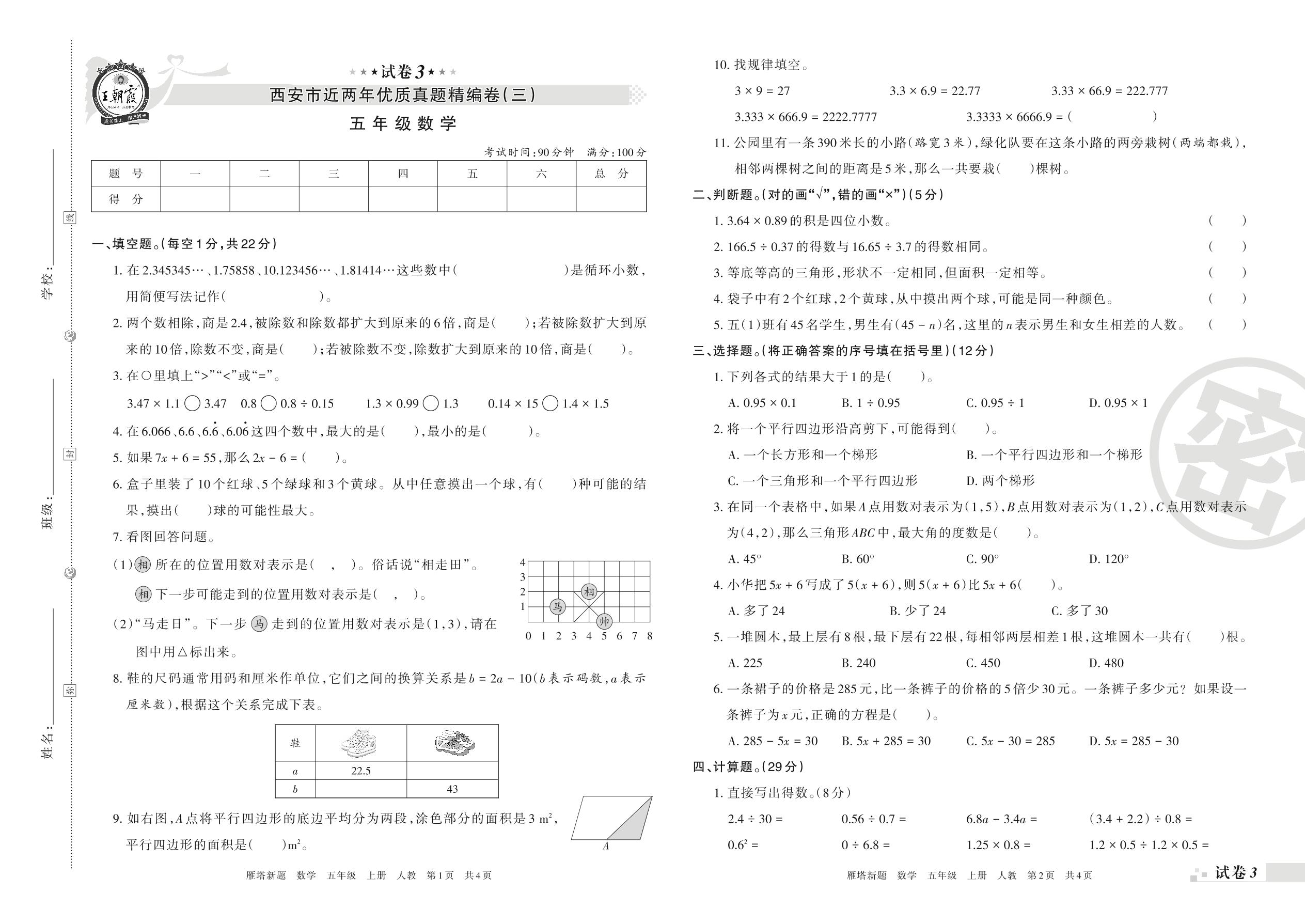 西安市近两年优质试题精编卷(三)五年级上册数学(人教版)_R211119101548857【3】
