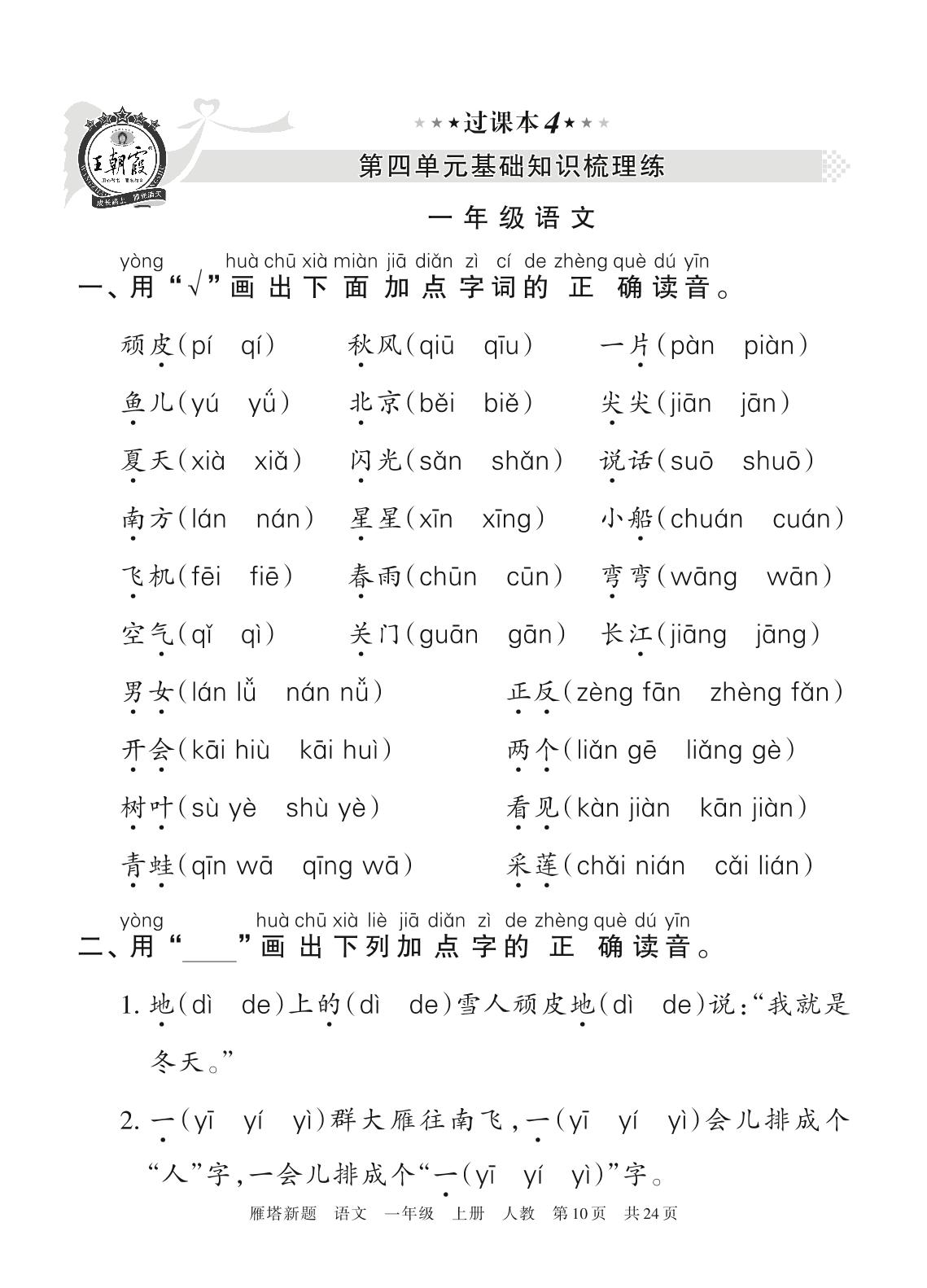 王朝霞期末过课本——第四单元基础知识梳理练一年级上册语文(人教版)【4】