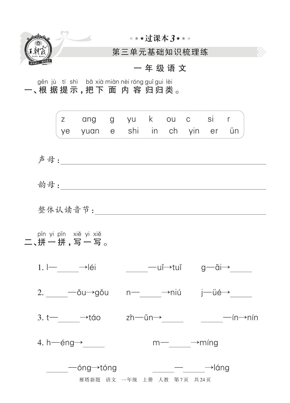 王朝霞期末过课本——第三单元基础知识梳理练一年级上册语文(人教版)【3】