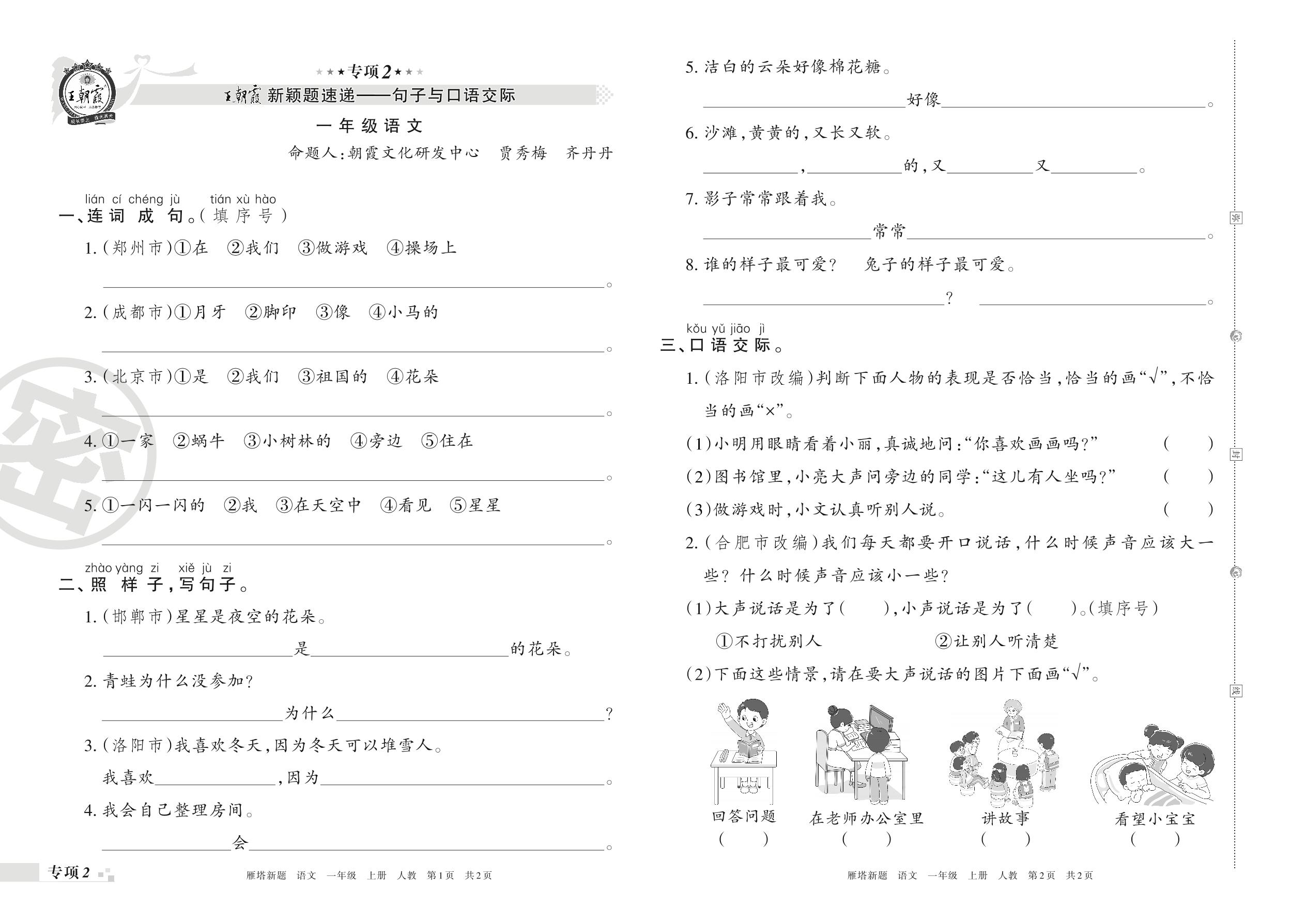 王朝霞期末专项卷——新颖题速递:句子与口语交际一年级上册语文(人教版)【2】