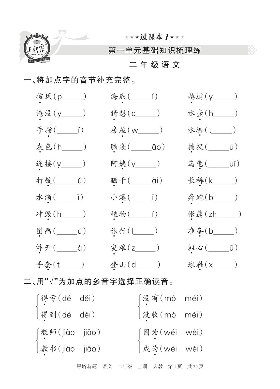 王朝霞期末过课本——第一单元基础知识梳理练二年级上册语文(人教版)【1】