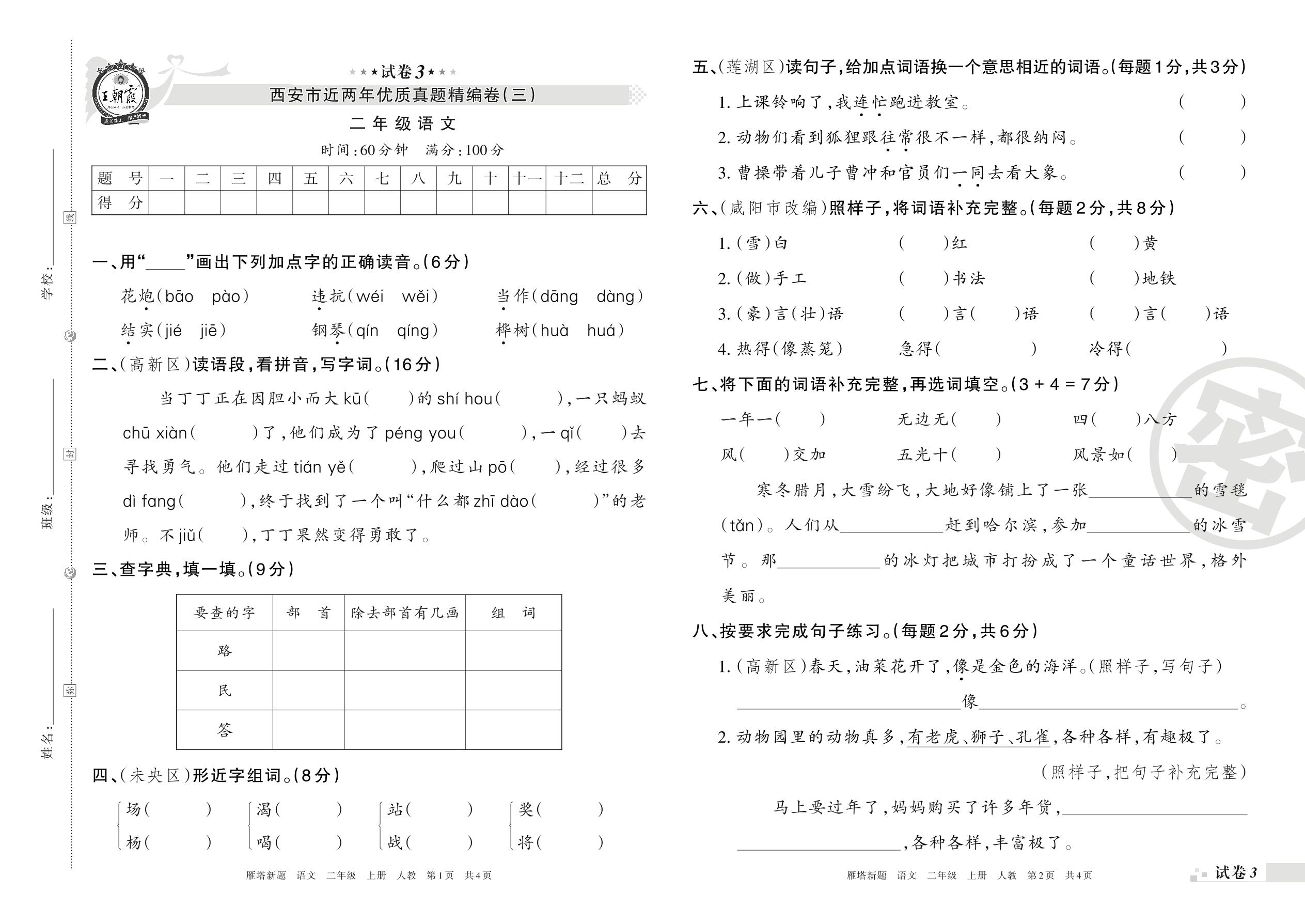 西安市近两年优质试题精编卷(三)二年级上册语文(人教版)_R211119102911829【3】