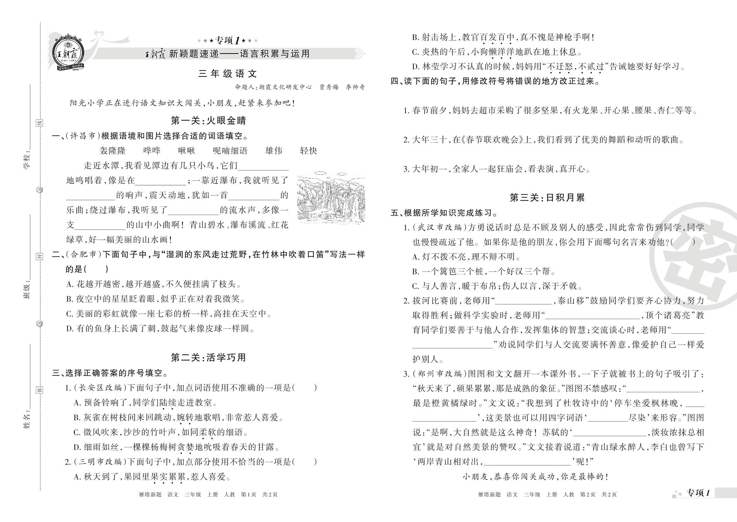 王朝霞期末专项卷——新颖题速递:语言积累与运用三年级上册语文(人教版)_R211119103959956【1】