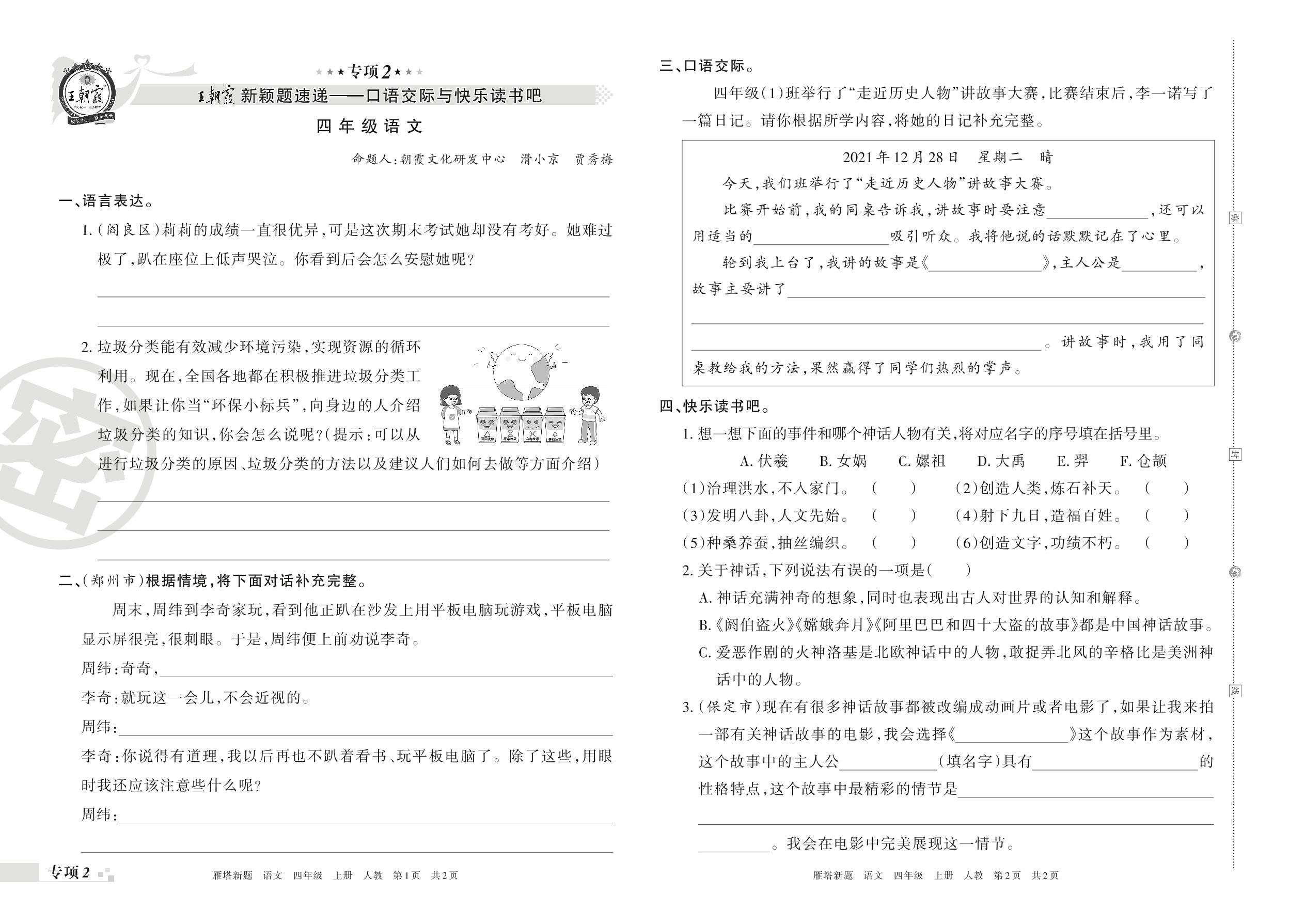 王朝霞期末专项卷——新颖题速递:口语交际与快乐读书吧四年级上册语文(人教版)_R211119104246522【2】