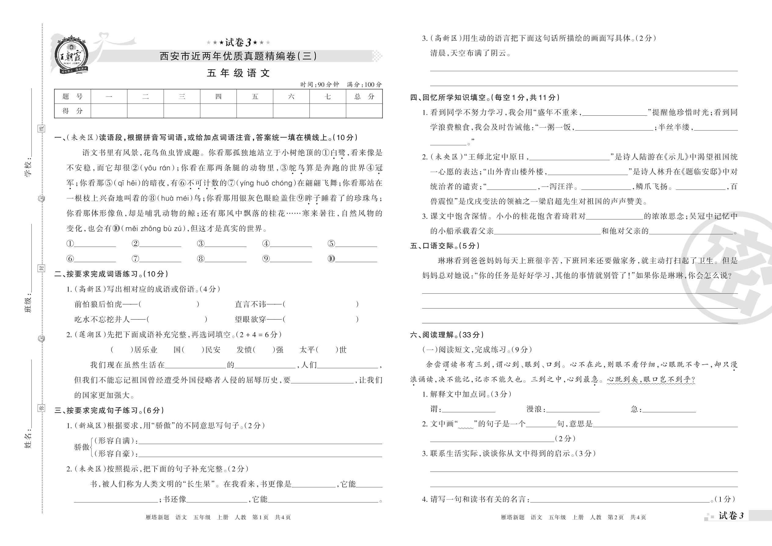 西安市近两年优质试题精编卷(三)五年级上册语文(人教版)_R211119104535590【3】