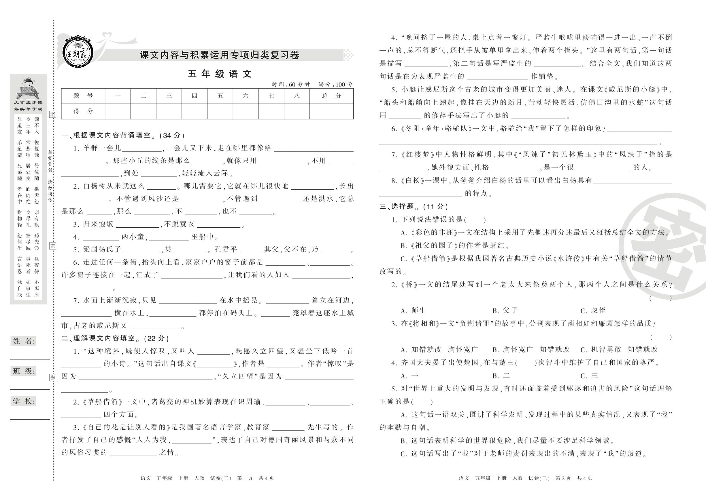 王朝霞期末专项卷五年级下册语文(人教版)_R210801203007【3】