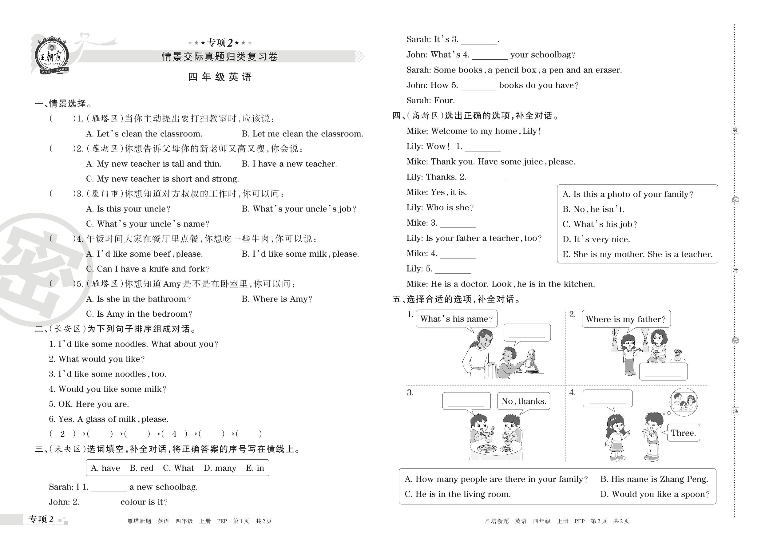 王朝霞期末专项卷——情景交际真题归类复习卷四年级上册英语(人教PEP版)_R211119110615325【2】
