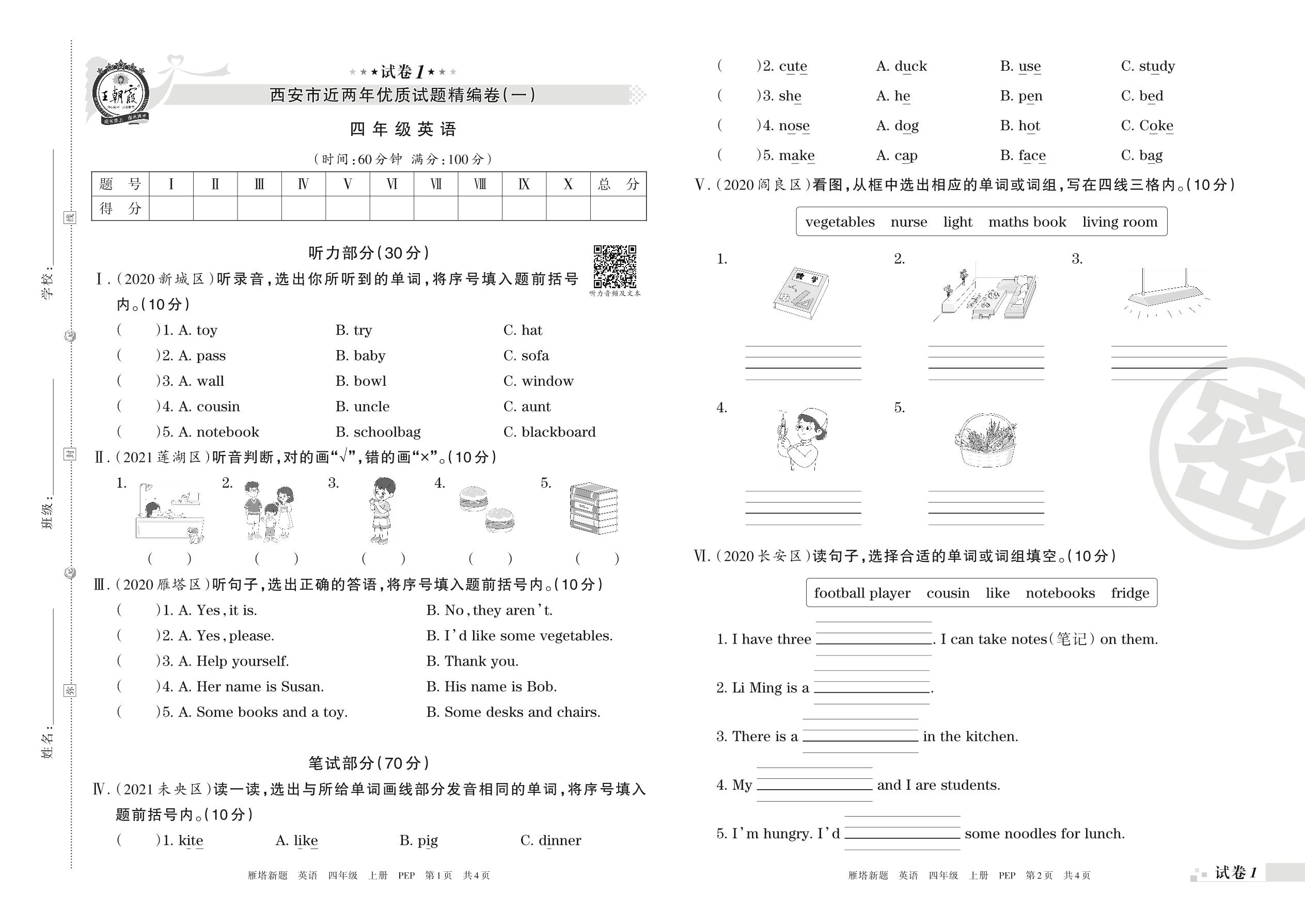 西安市近两年优质试题精编卷(一)四年级上册英语(人教PEP版)【1】