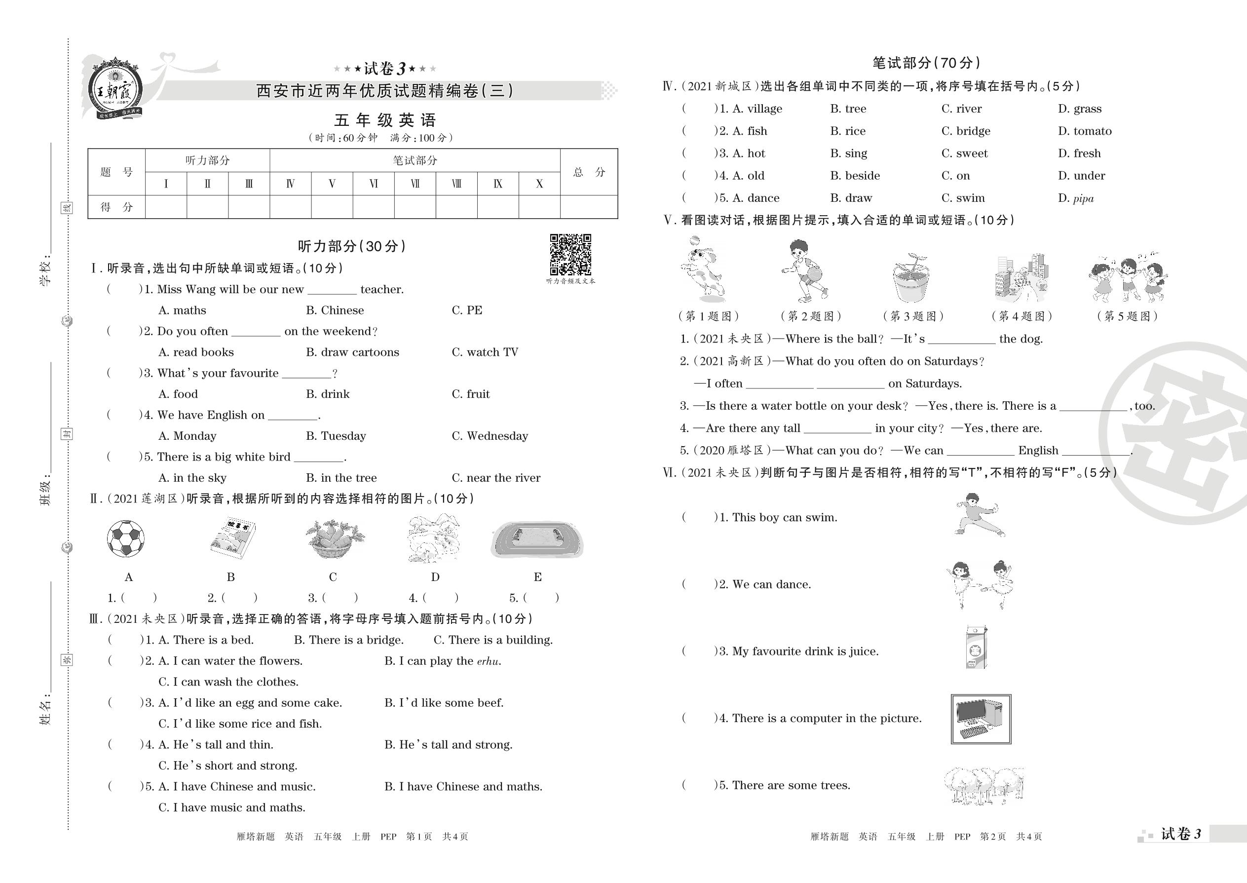 西安市近两年优质试题精编卷(三)五年级上册英语(人教PEP版)【3】