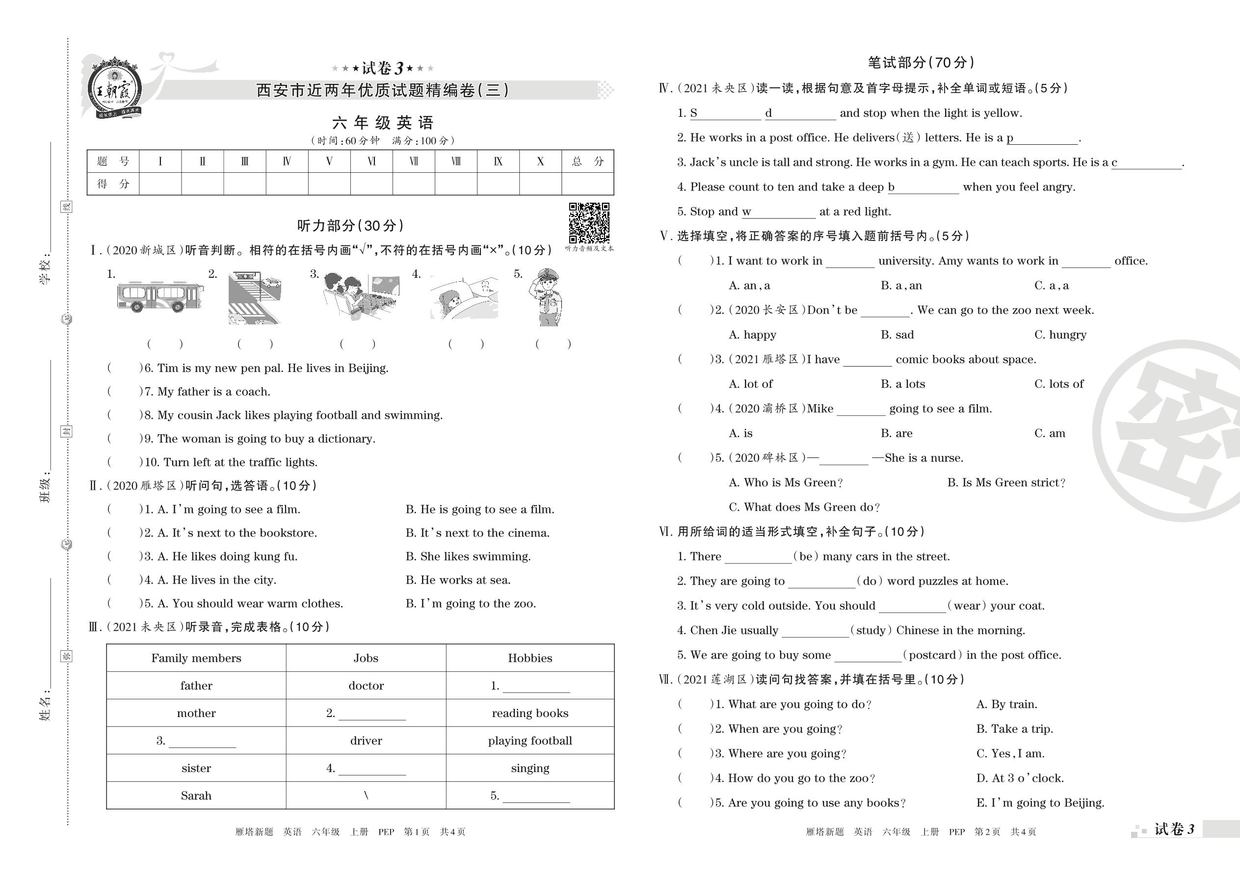 西安市近两年优质试题精编卷(三)六年级上册英语(人教PEP版)【3】