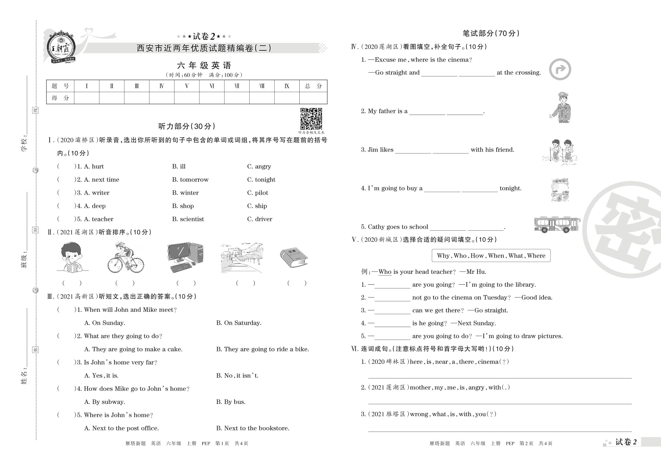 西安市近两年优质试题精编卷(二)六年级上册英语(人教PEP版)【2】