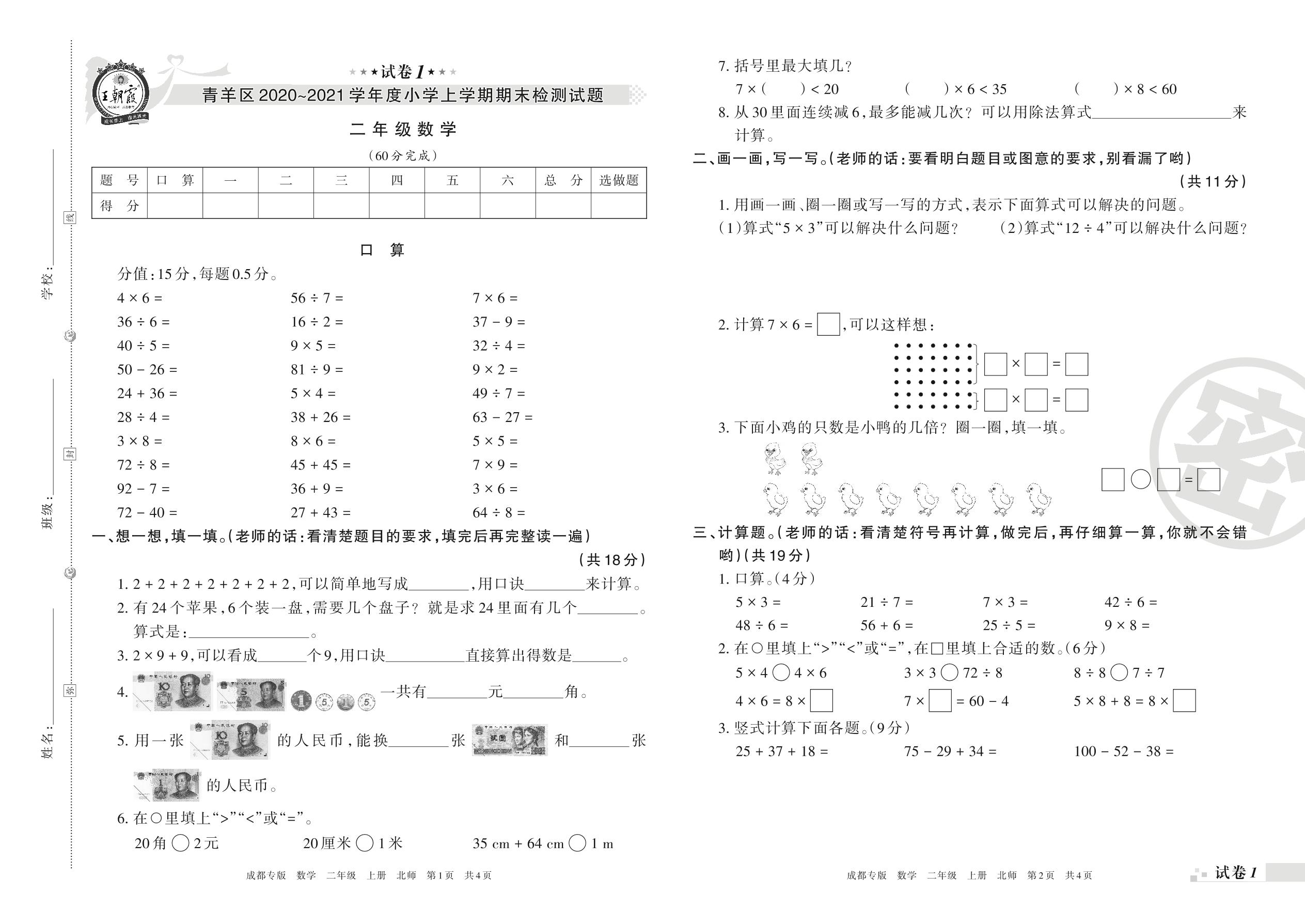 青羊区2020~2021学年度小学上学期期末检测试题二年级数学(北师版)【1】