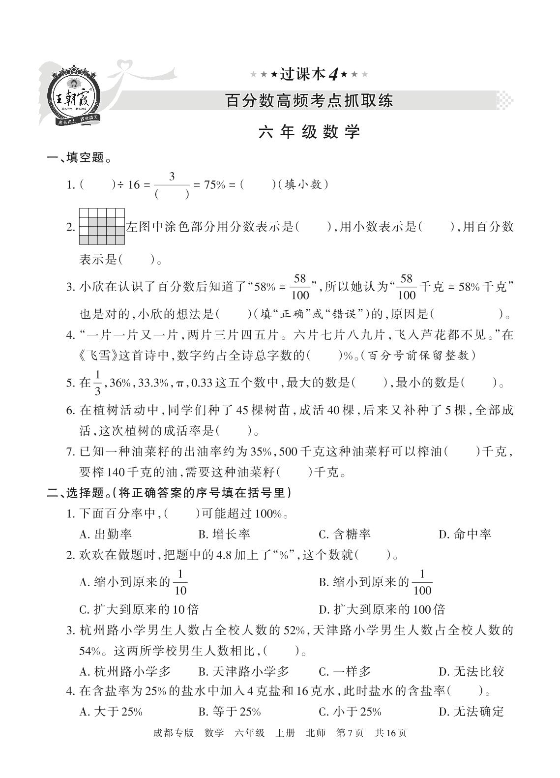 王朝霞期末过课本——百分数高频考点抓取练六年级上册数学(北师版)_R211119112504340【4】