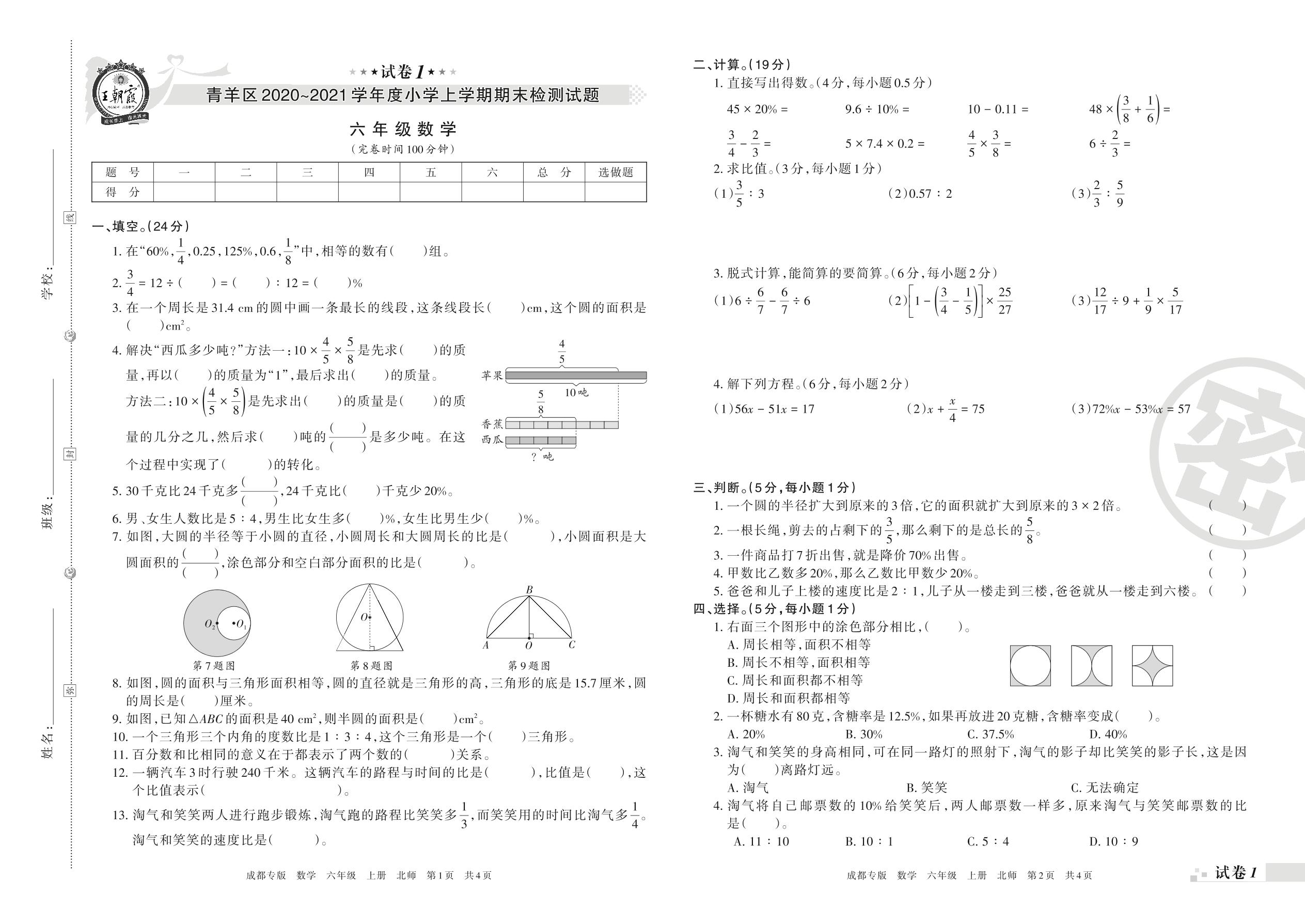 青羊区2020~2021学年度小学上学期期末检测试题六年级数学(北师版)【1】