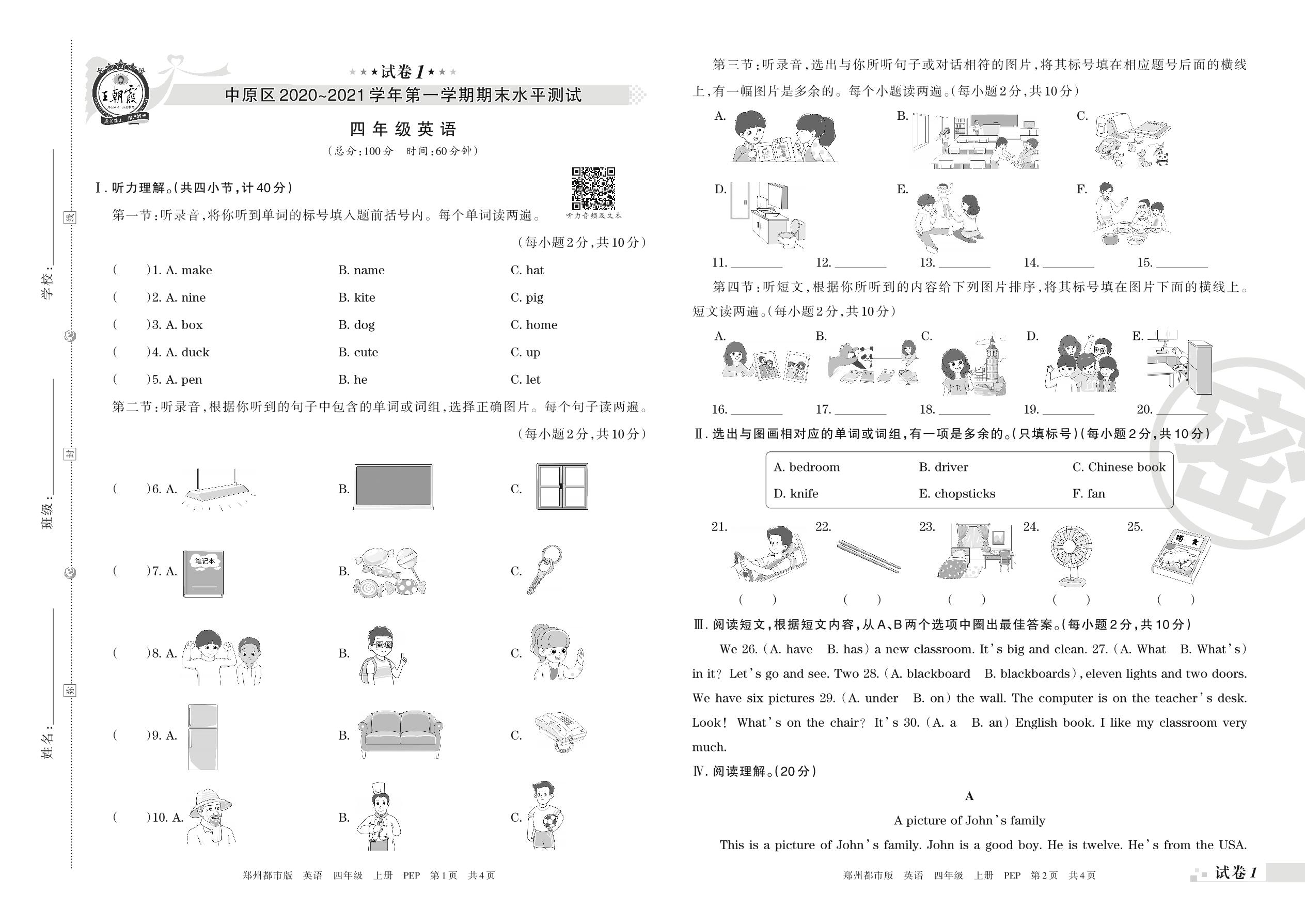 中原区2020~2021学年第一学期期末水平测试四年级英语(人教PEP版)【1】