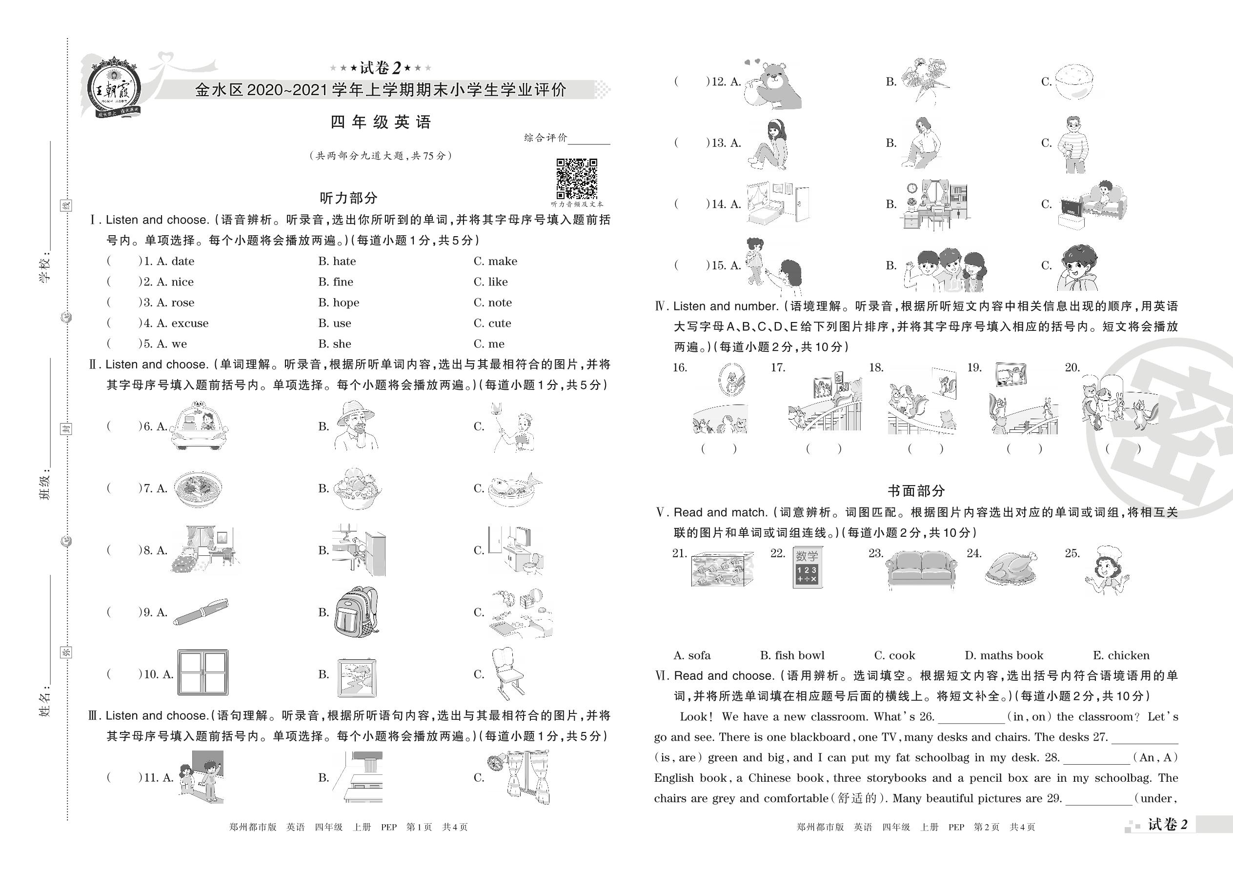 金水区2020~2021学年上学期期末小学生学业评价四年级英语(人教PEP版)【2】