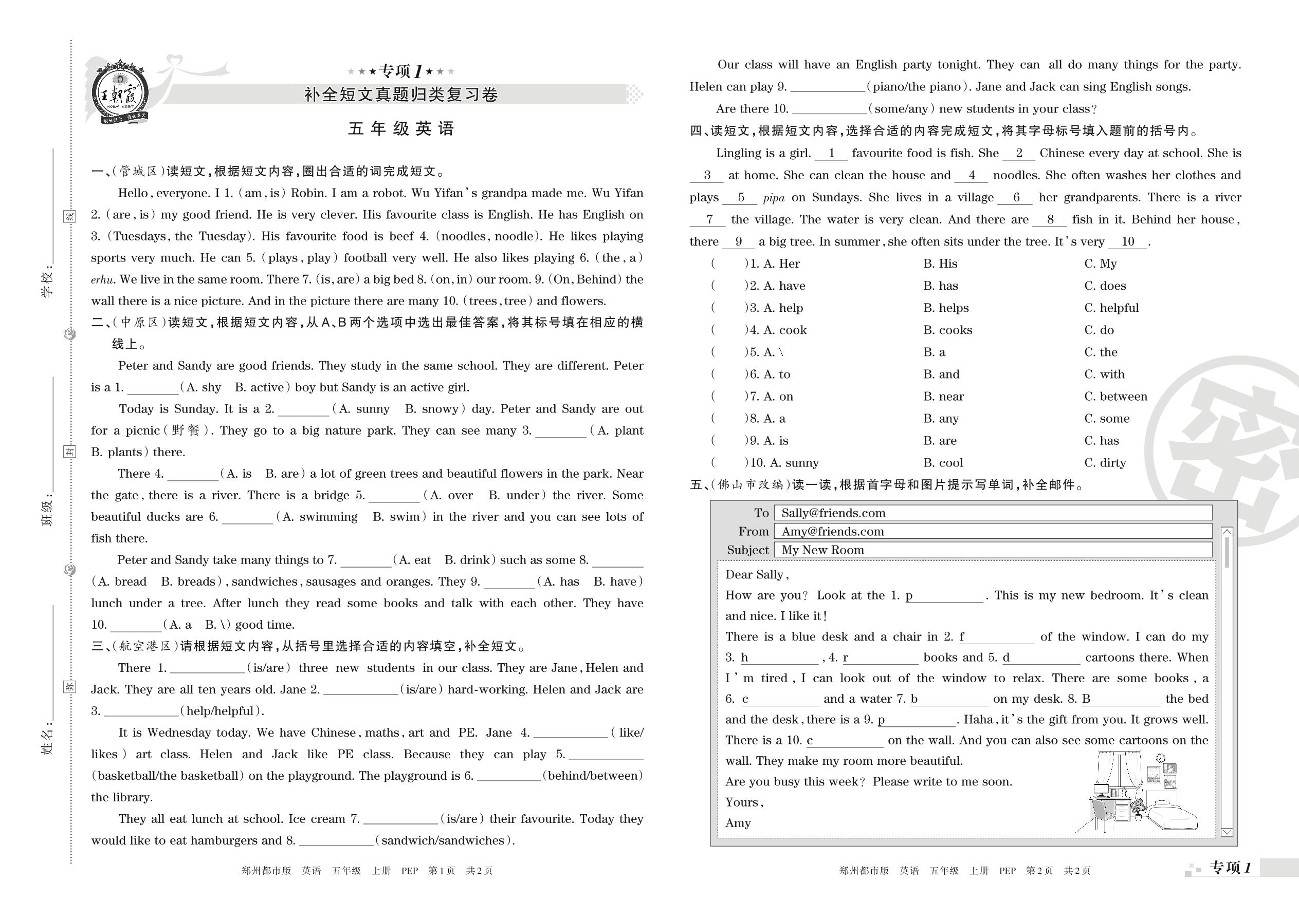 王朝霞期末专项卷——补全短文真题归类复习卷五年级上册英语(人教PEP版)【1】