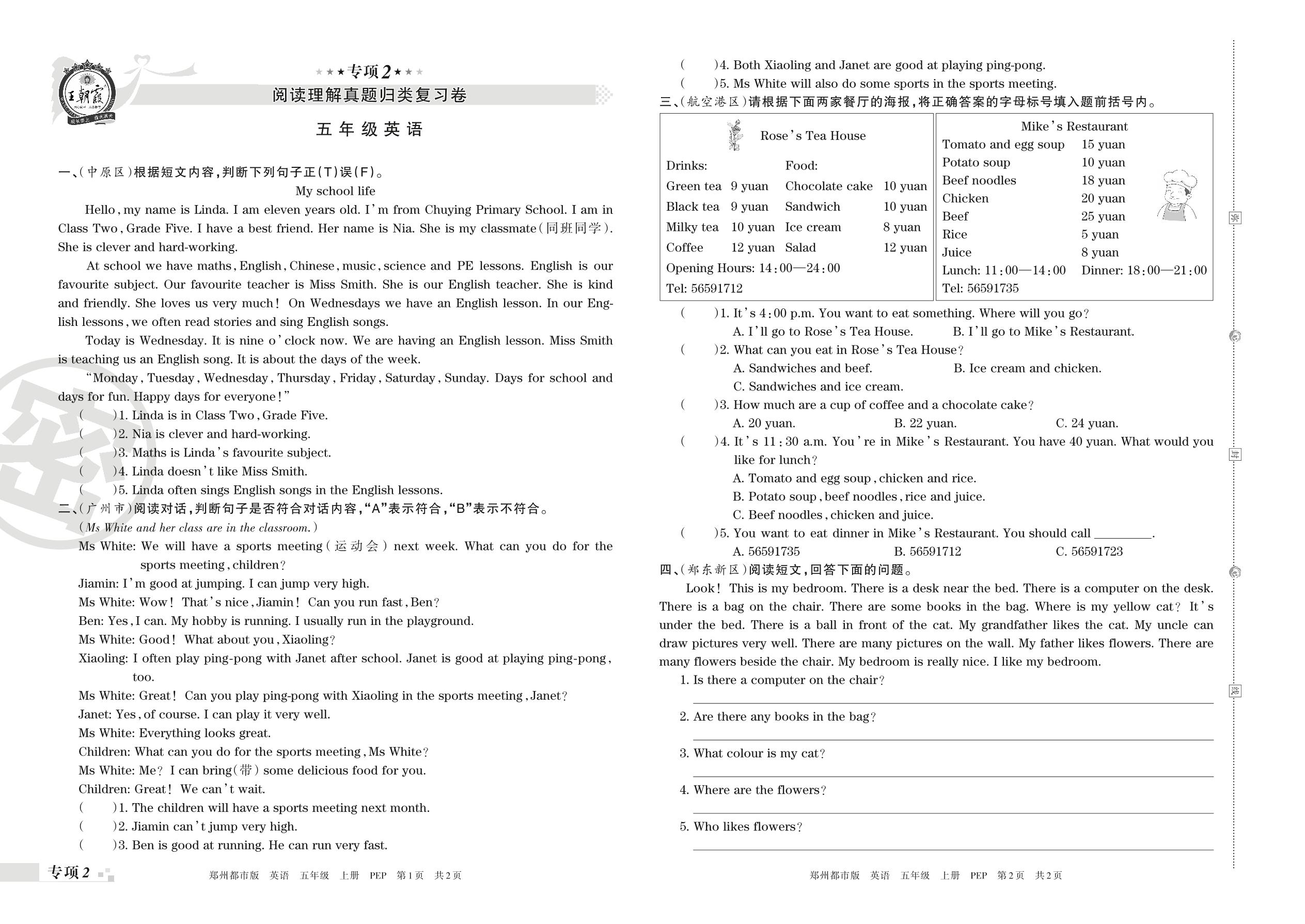 王朝霞期末专项卷——阅读理解真题归类复习卷五年级上册英语(人教PEP版)_R211120111933435【2】