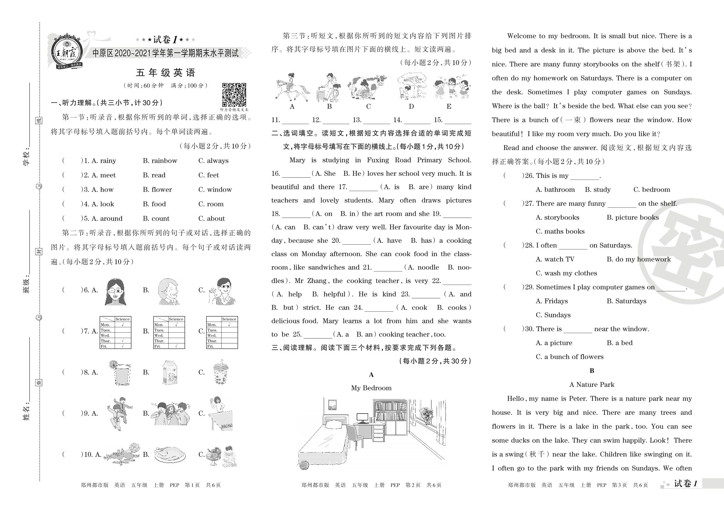 五年级英语人教PEP版(三起始)上册期末卷