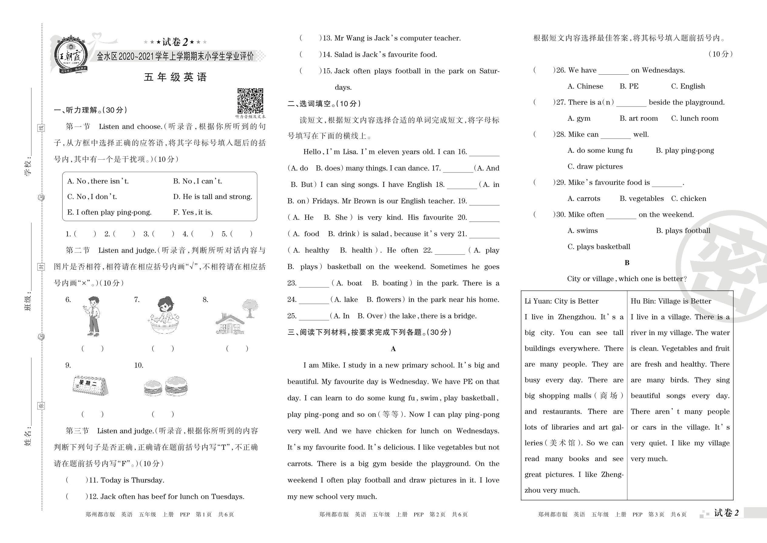 金水区2020~2021学年上学期期末小学生学业评价五年级英语(人教PEP版)【2】