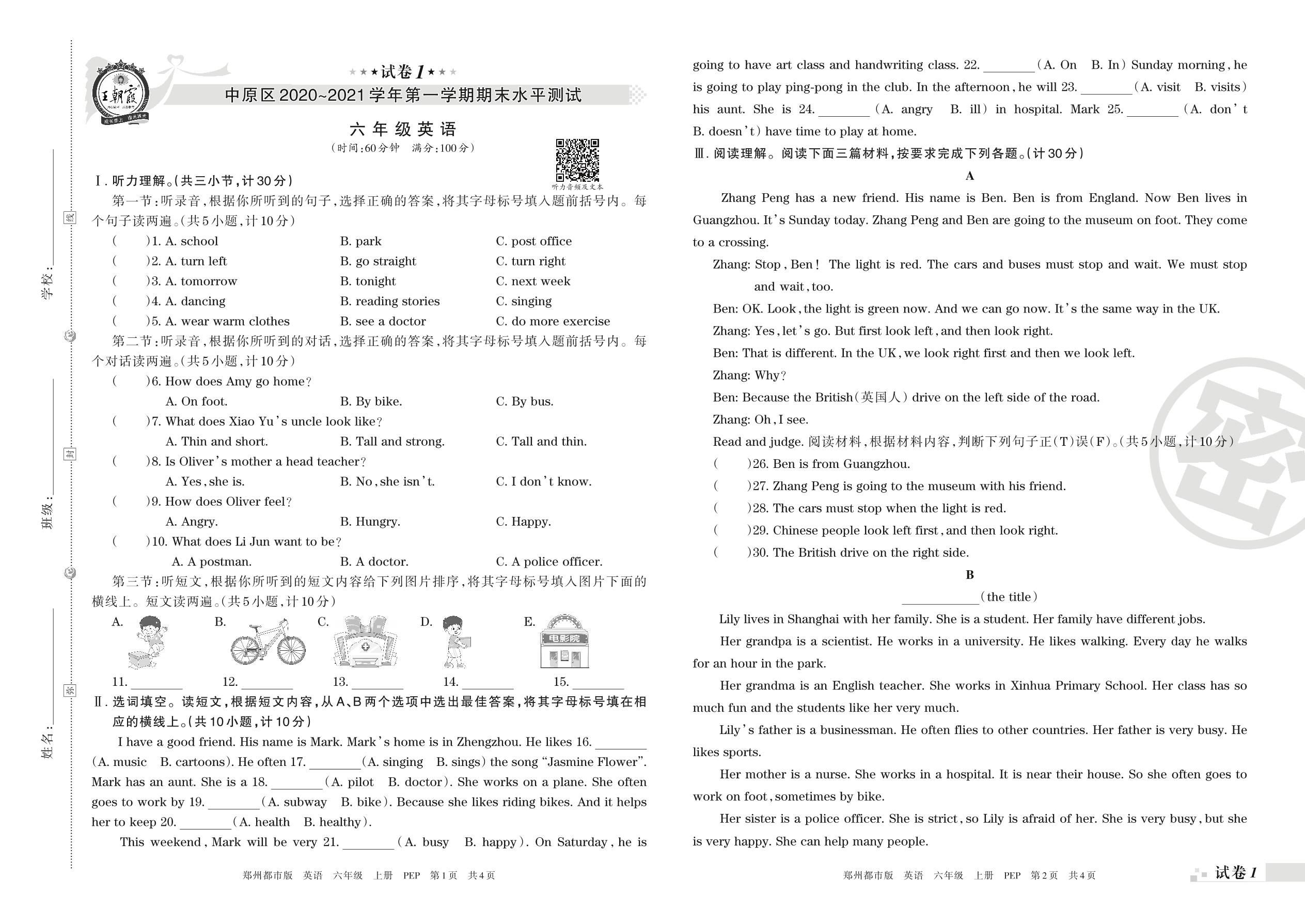 中原区2020~2021学年第一学期期末水平测试六年级英语(人教PEP版)【1】