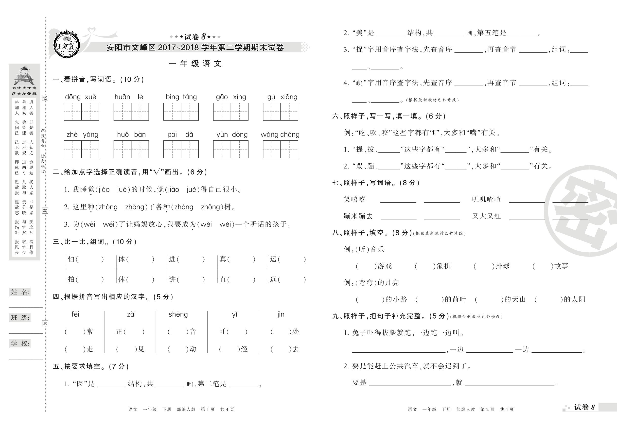 2017-2018学年第二学期安阳市文峰区一年级语文试卷(人教版)【8】