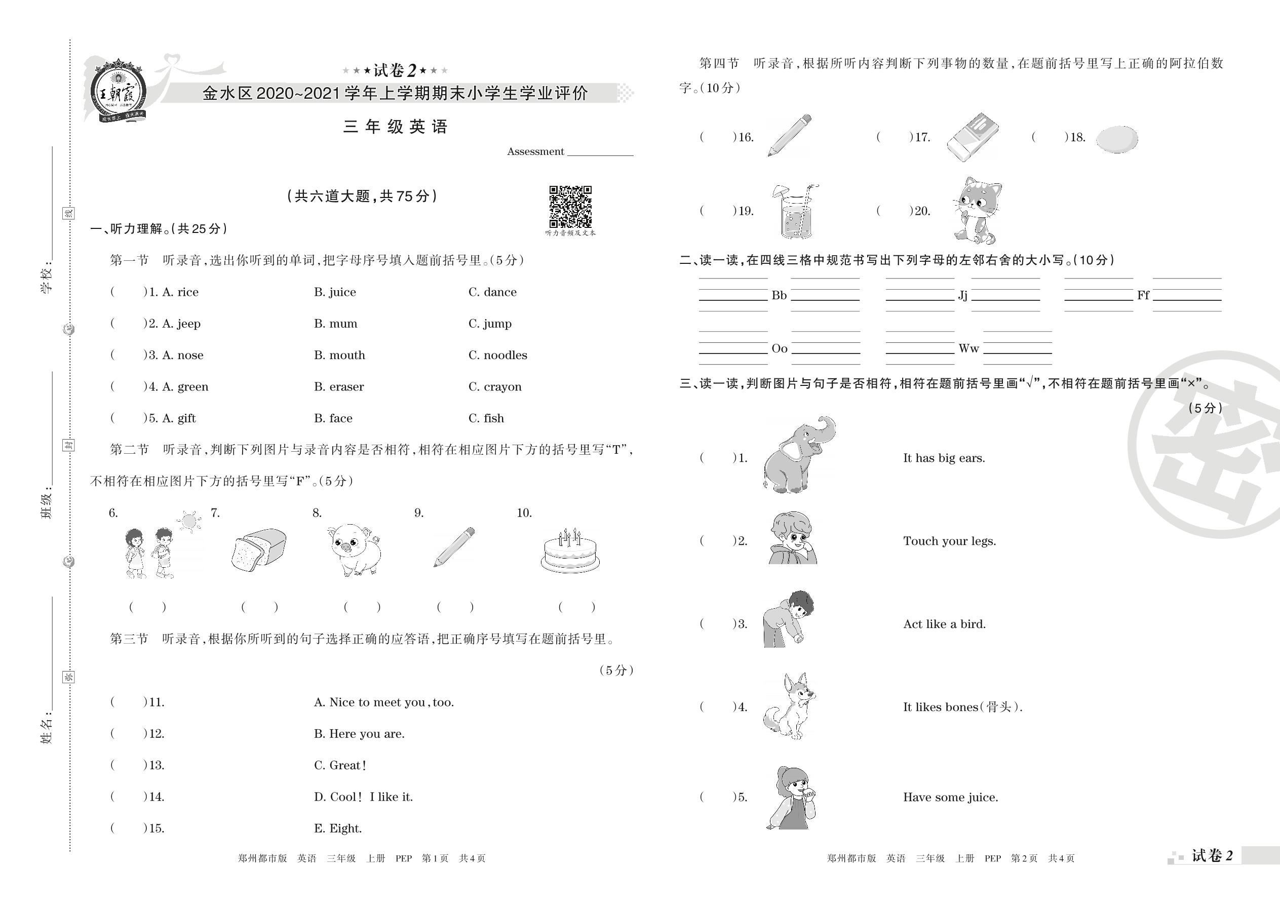金水区2020~2021学年上学期期末小学生学业评价三年级英语(人教PEP版)【2】