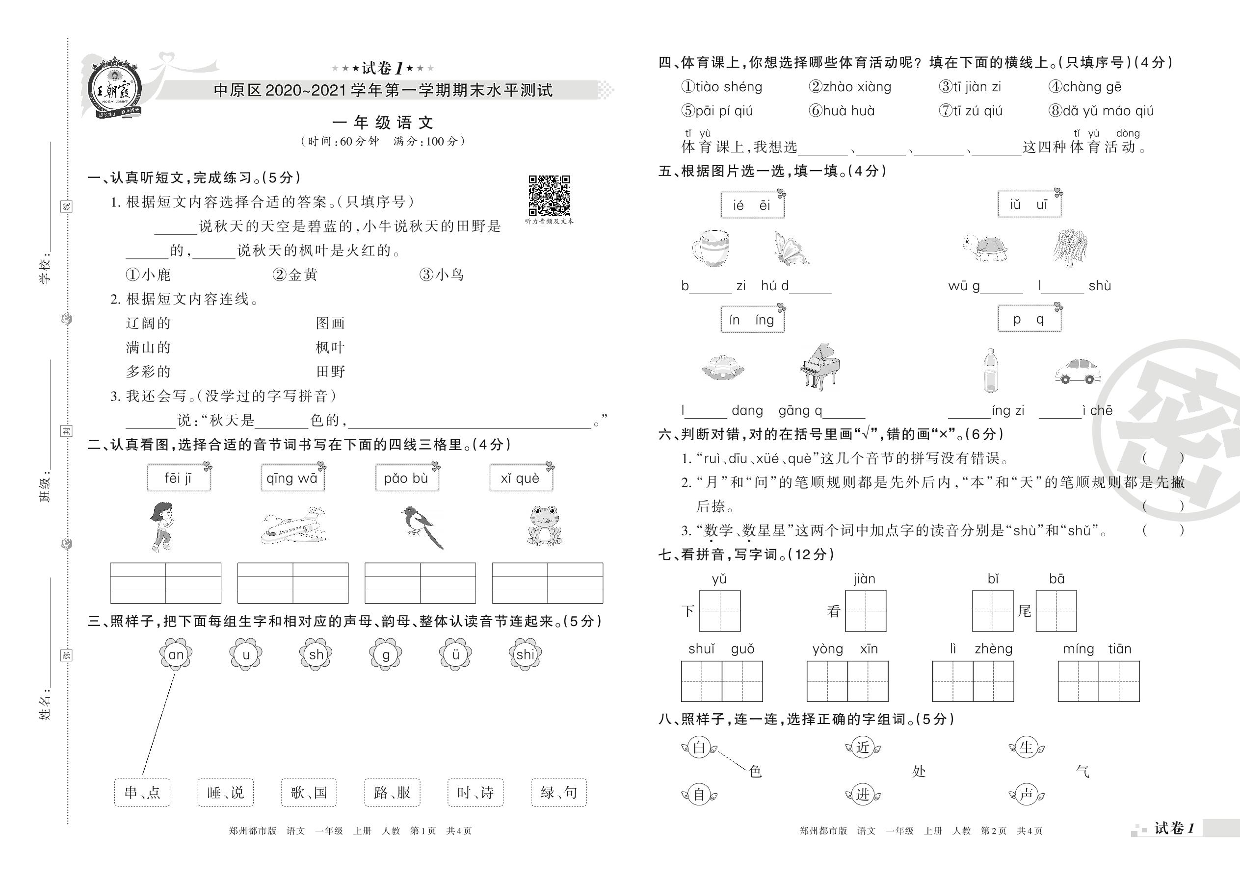中原区2020~2021学年第一学期期末水平测试一年级语文(人教版)【1】