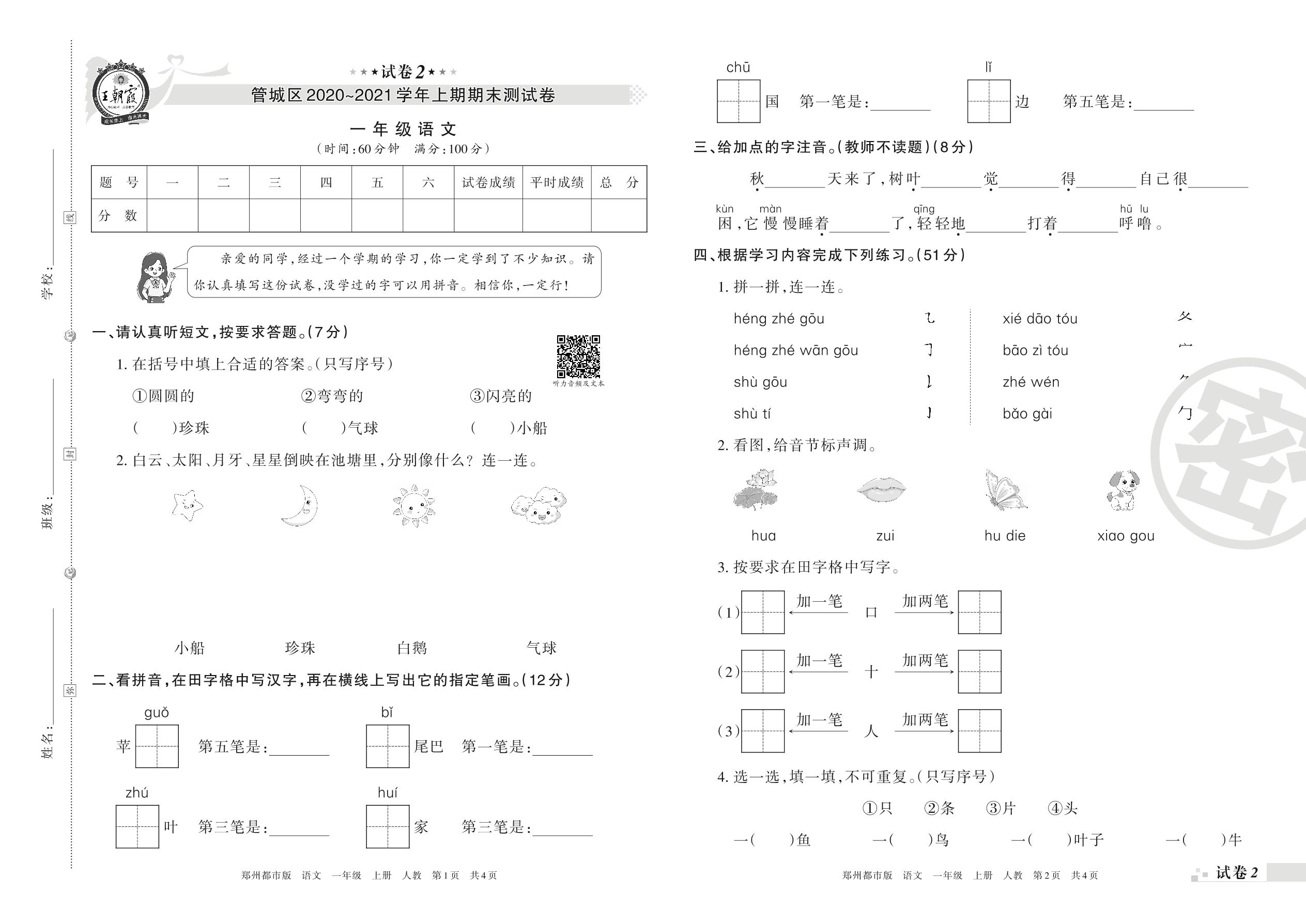 管城区2020~2021学年上期期末测试卷一年级语文(人教版)【2】