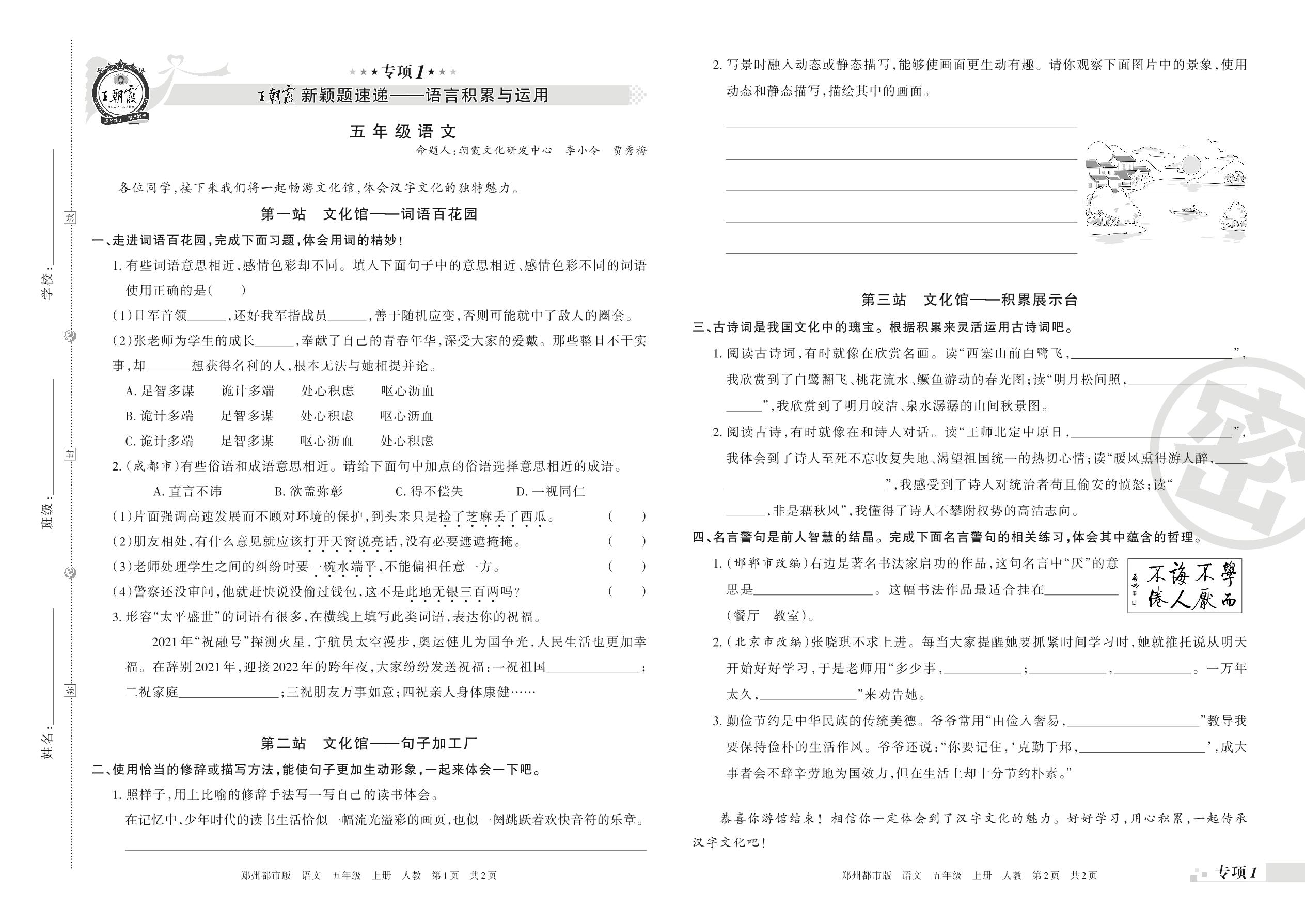王朝霞期末专项卷——新颖题速递:语言积累与运用五年级上册语文(人教版)_R211120134601778【1】