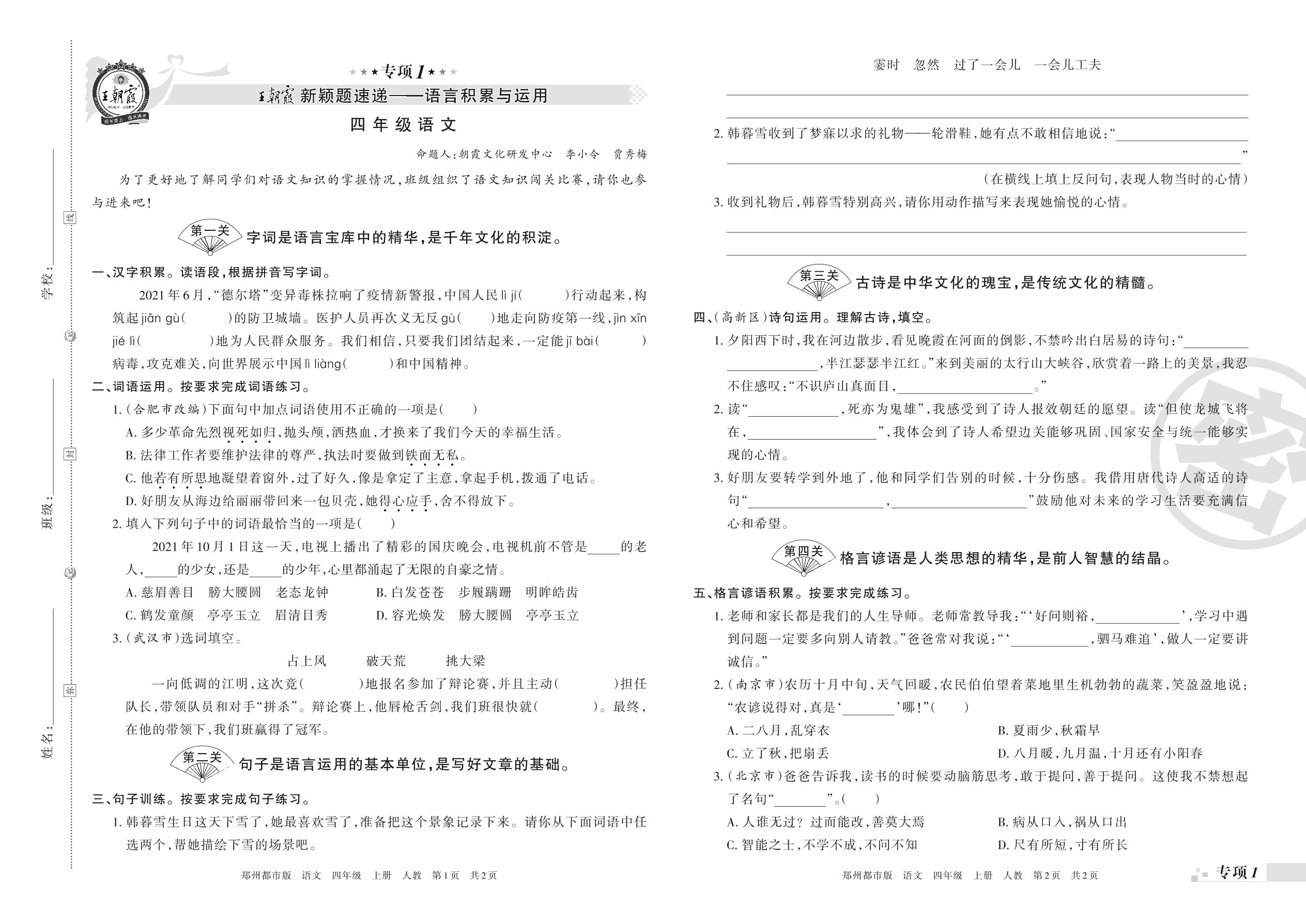王朝霞期末专项卷——新颖题速递:语言积累与运用四年级上册语文(人教版)_R211120134914745【1】
