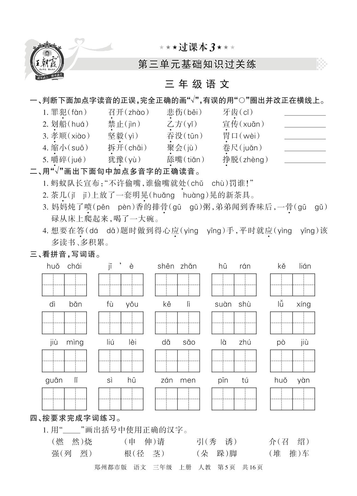 王朝霞期末过课本——第三单元基础知识过关练三年级上册语文(人教版)_R211120135223933【3】