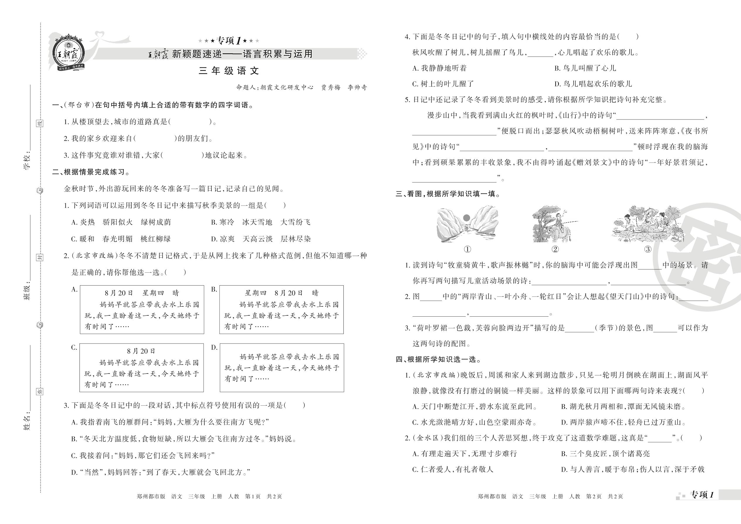 王朝霞期末专项卷——新颖题速递:语言积累与运用三年级上册语文(人教版)_R211120135223685【1】
