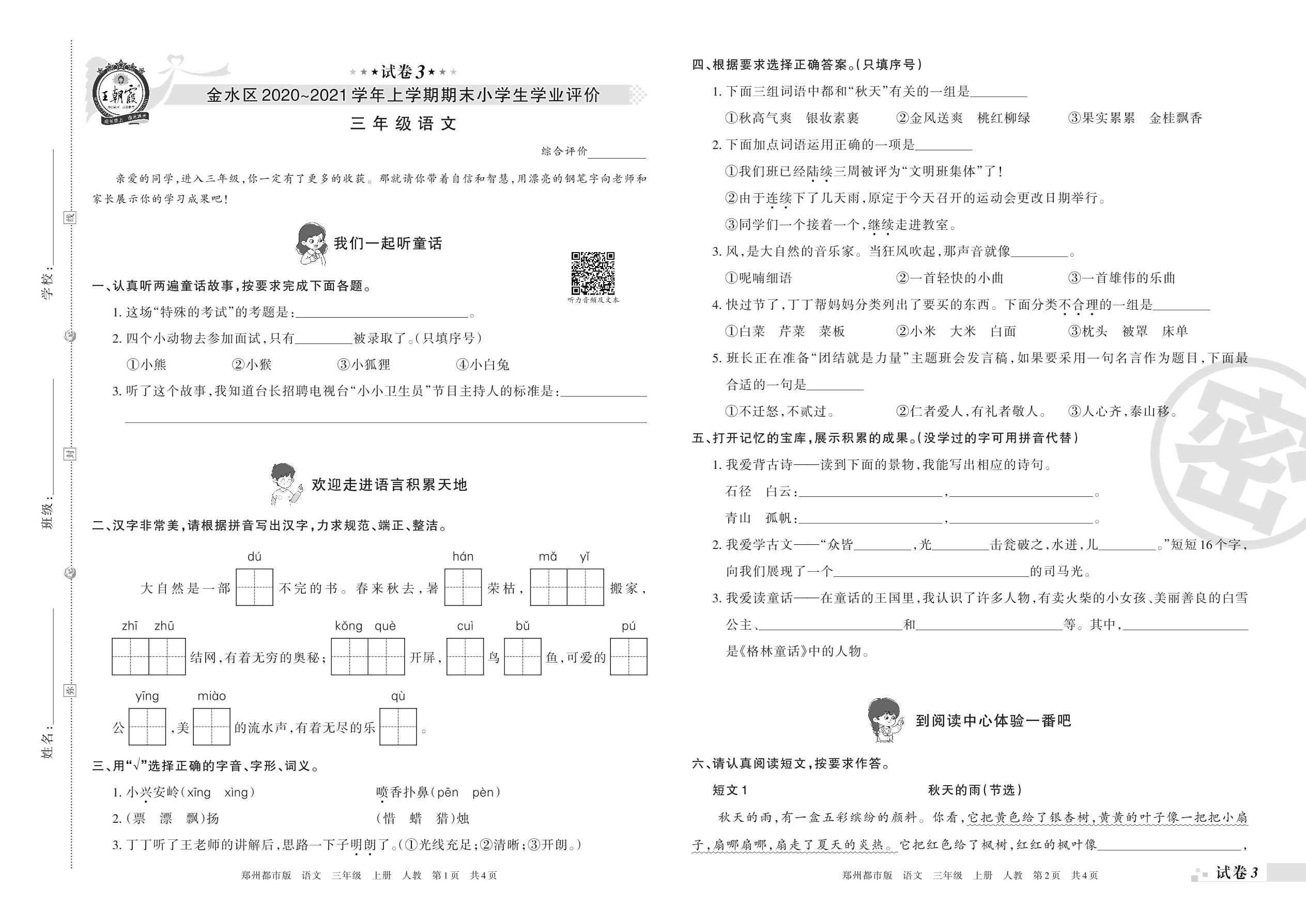 金水区2020~2021学年上学期期末小学生学业评价三年级语文(人教版)【3】