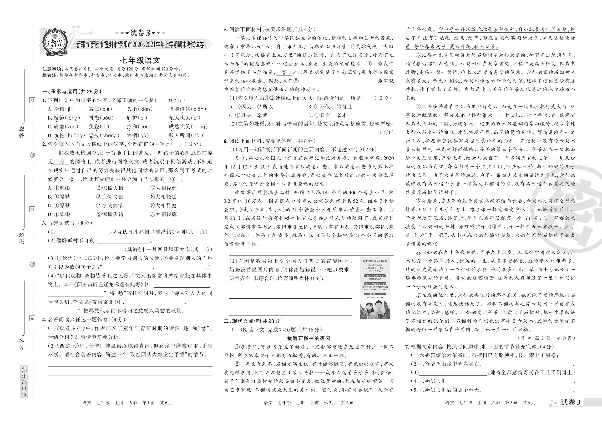 新郑市、新密市、登封市、荥阳市2020~2021学年上学期期末考试试卷七年级语文(人教版)【3】