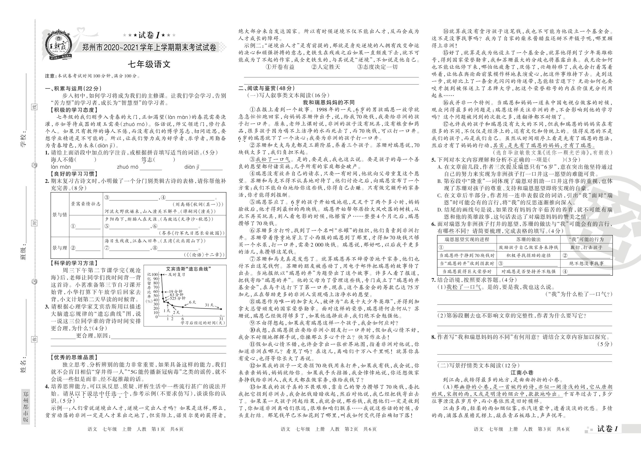 郑州市2020~2021学年上学期期末考试试卷七年级语文(人教版)【1】