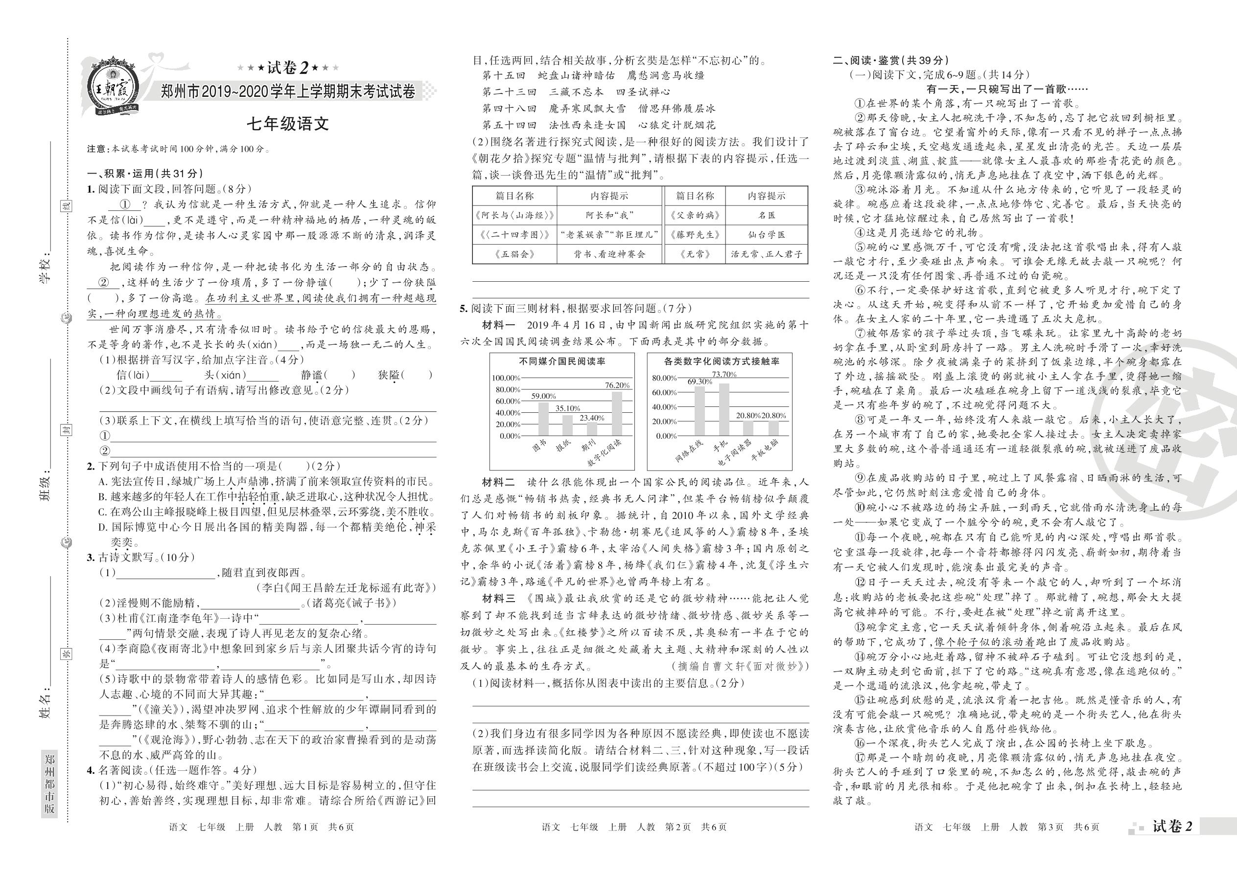 郑州市2019~2020学年上学期期末考试试卷七年级语文(人教版)【2】