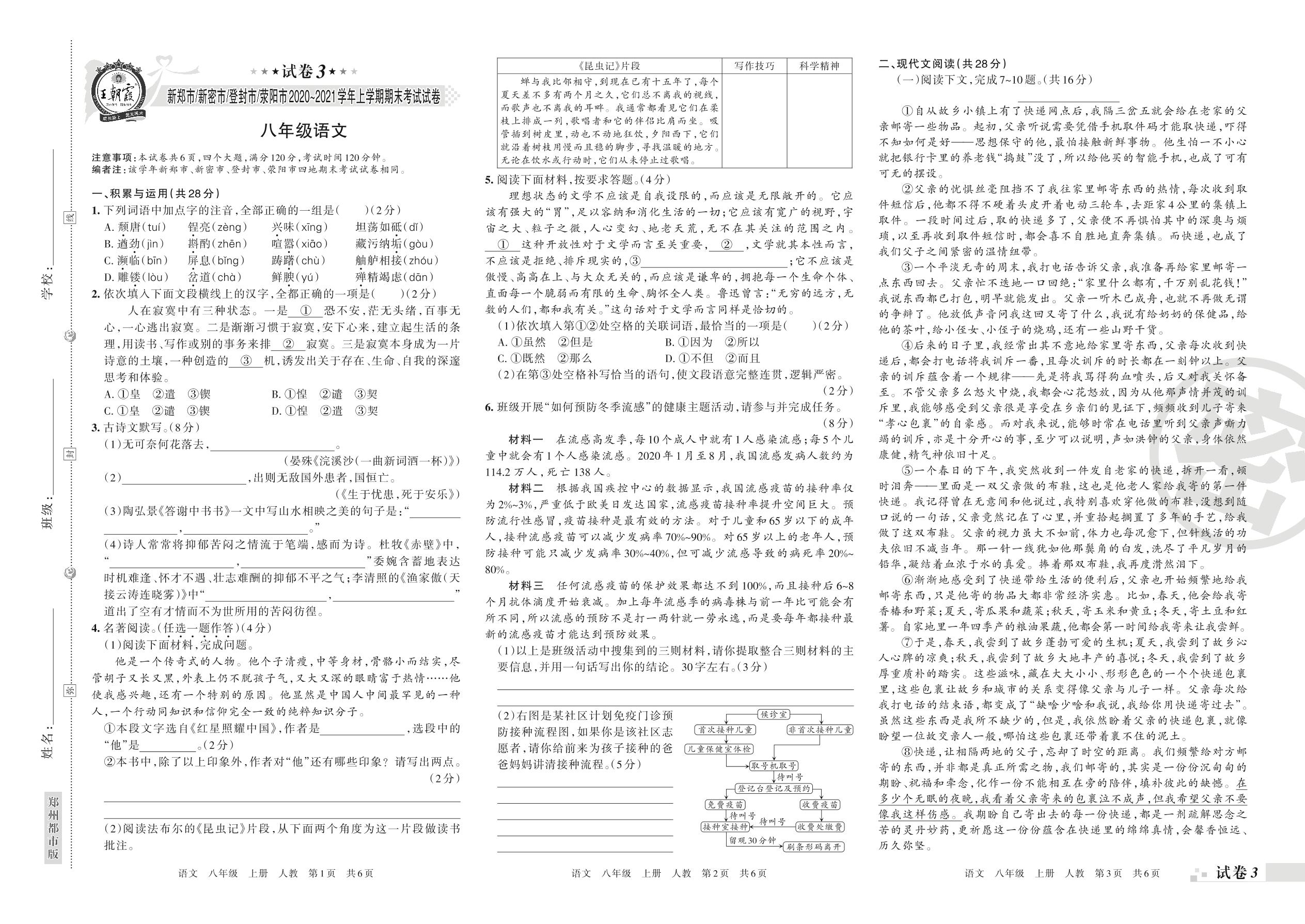 新郑市、新密市、登封市、荥阳市2020~2021学年上学期期末考试试卷八年级语文(人教版)【3】