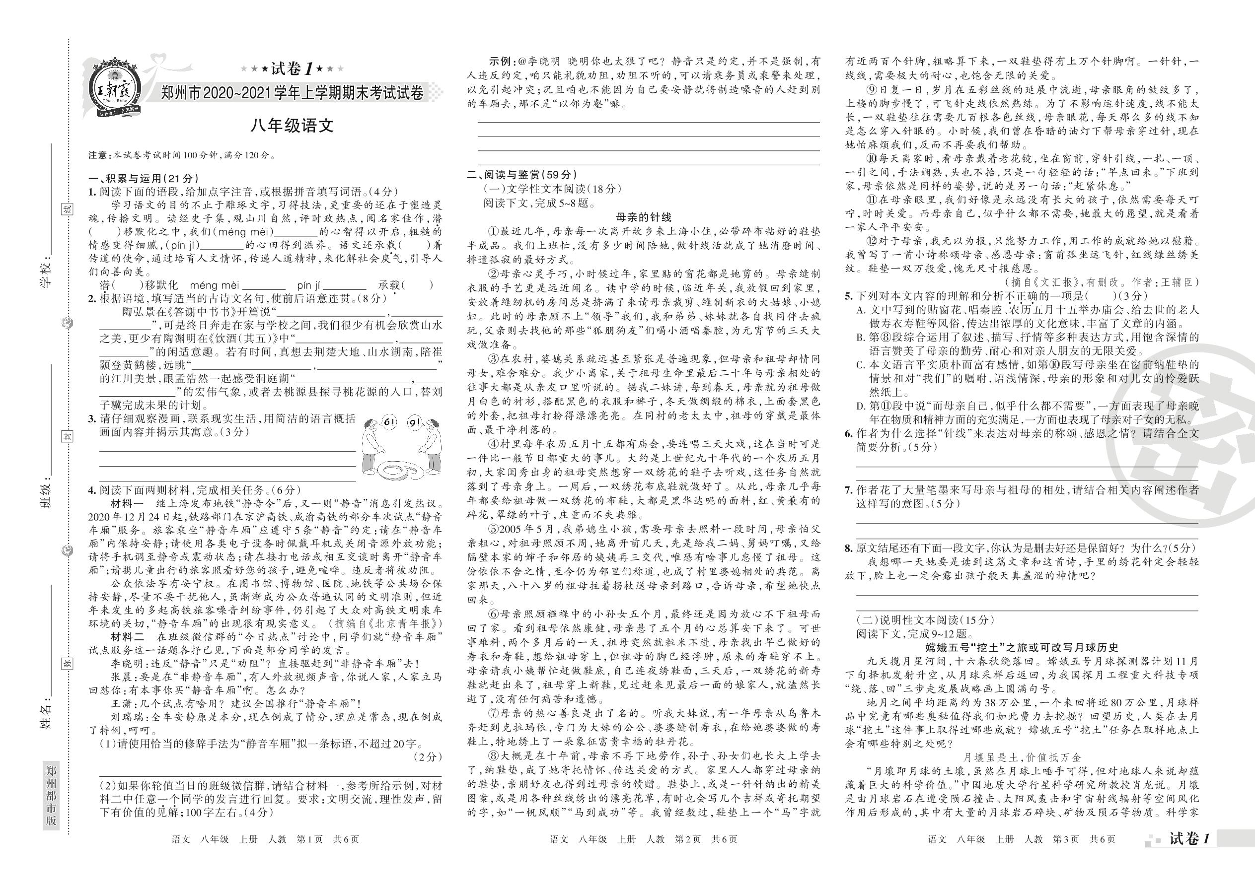 郑州市2020~2021学年上学期期末考试试卷八年级语文(人教版)【1】