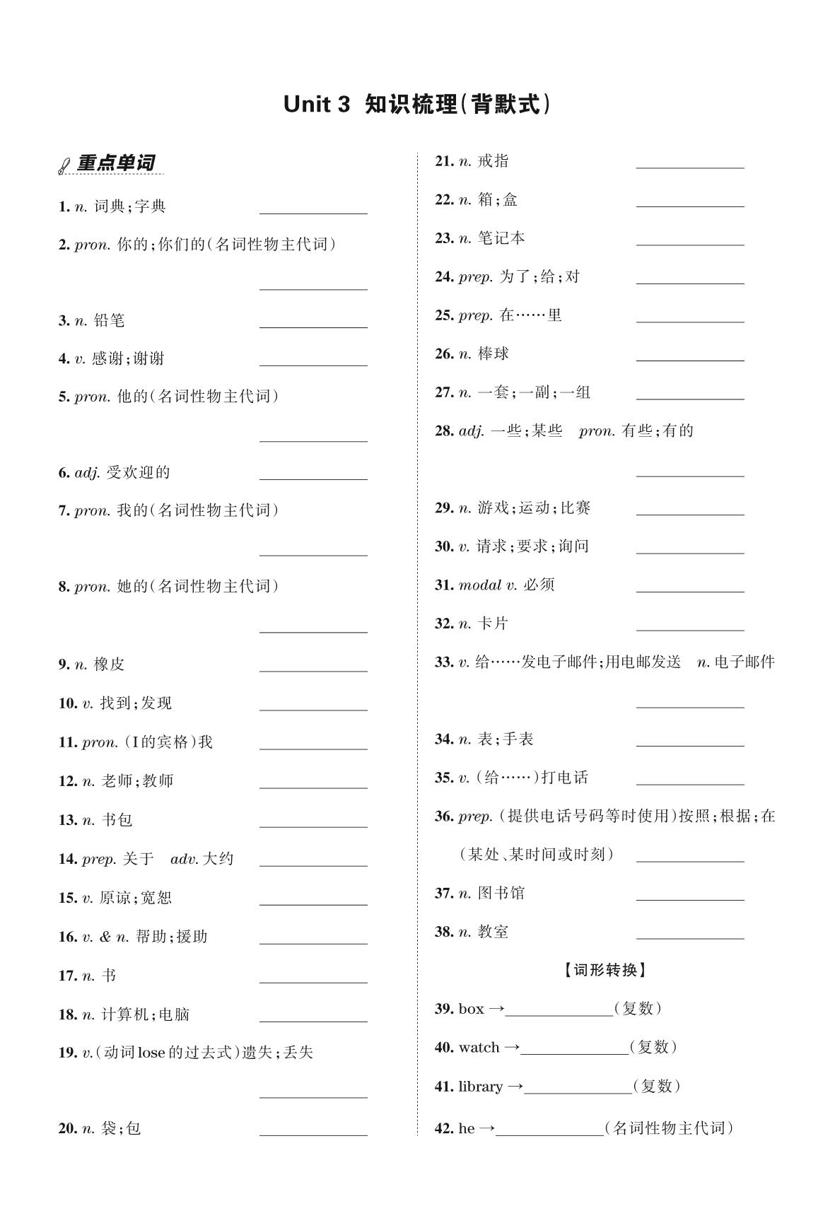 王朝霞期末过课本——Unit 3 知识梳理(背默式)七年级上册英语(人教版)【4】