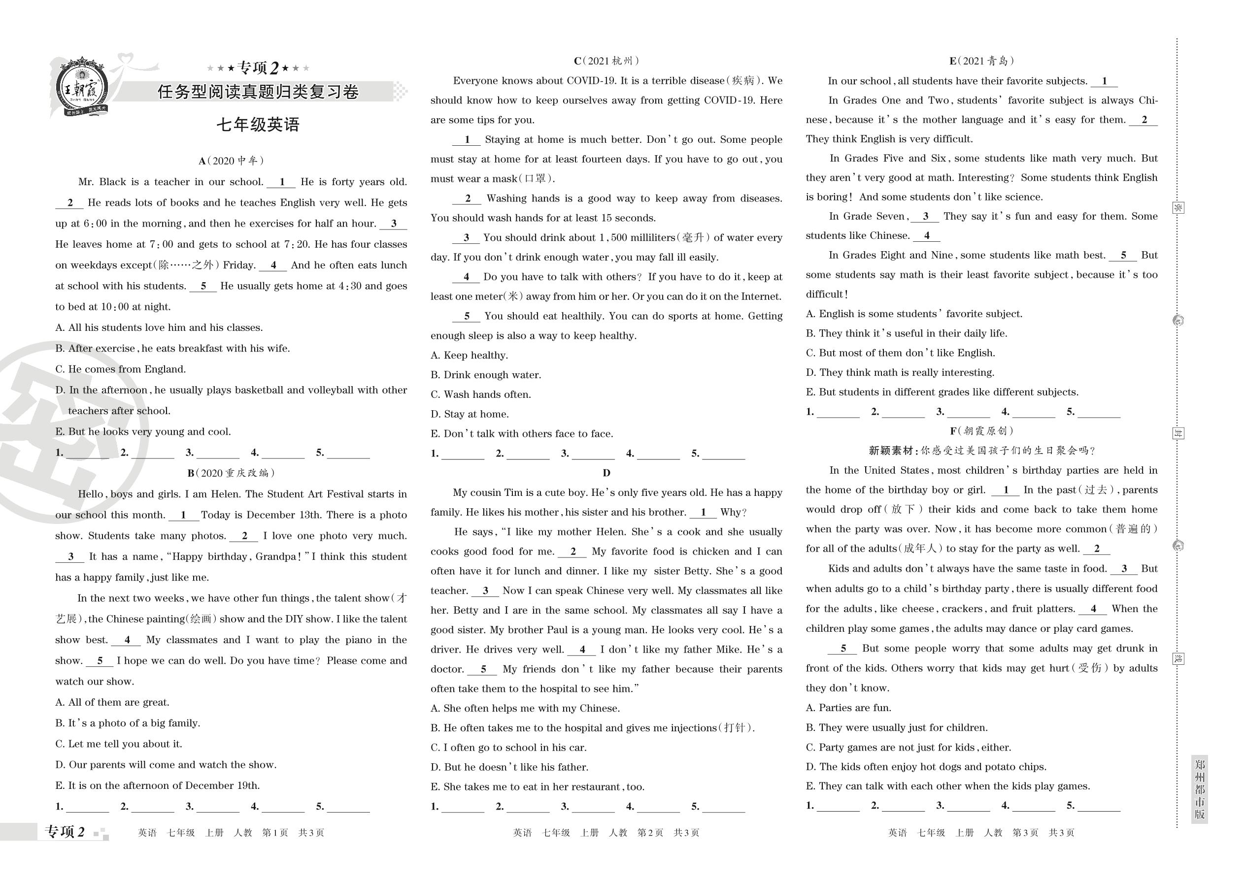 王朝霞期末专项卷——任务型阅读真题归类复习卷七年级上册英语(人教版)【2】