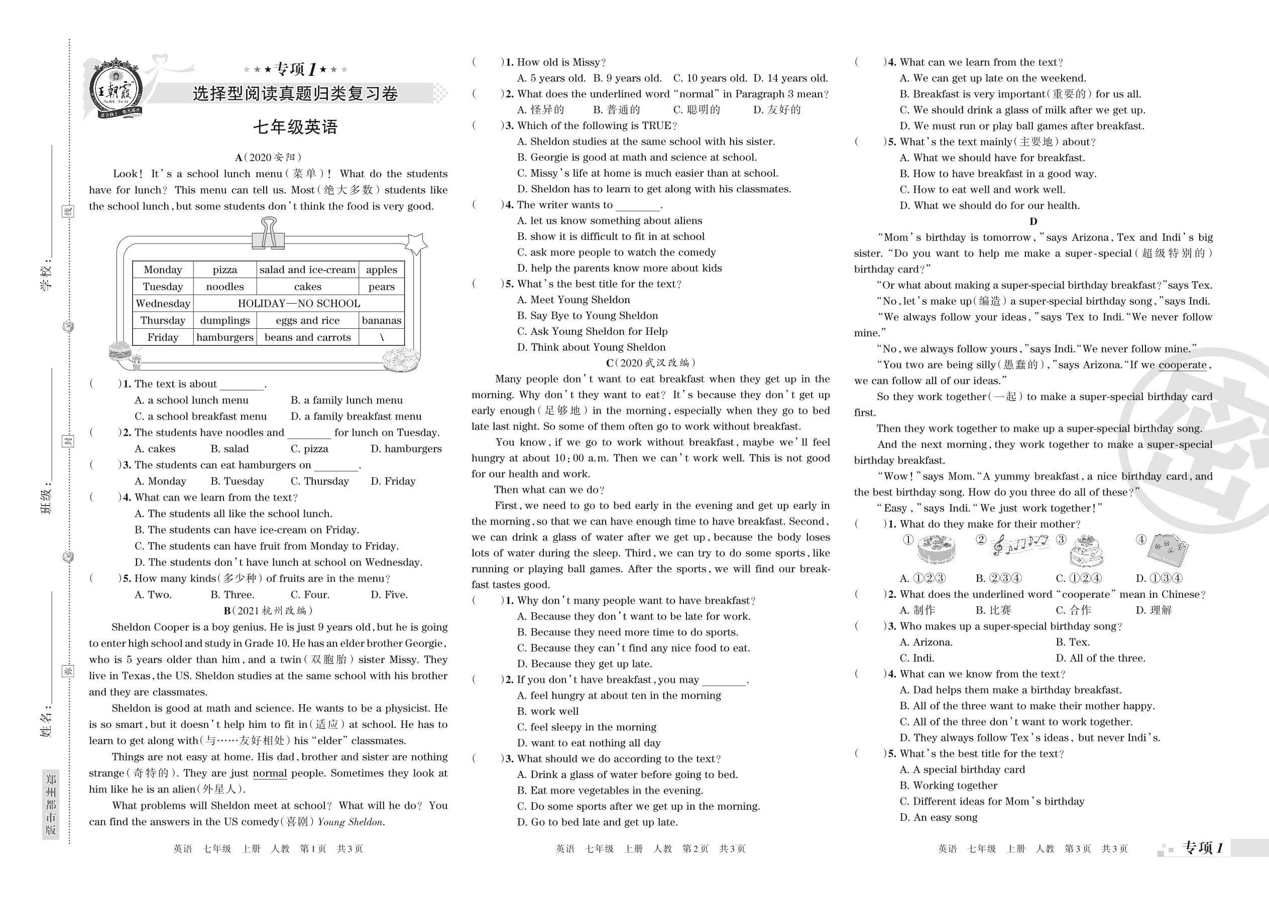 王朝霞期末专项卷——选择型阅读真题归类复习卷七年级上册英语(人教版)【1】
