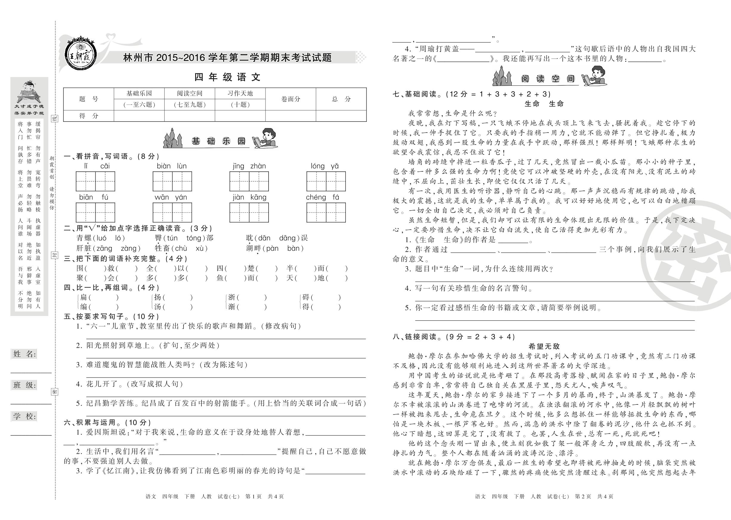 2015-2016学年第二学期林州市四年级语文试卷(人教版)【7】